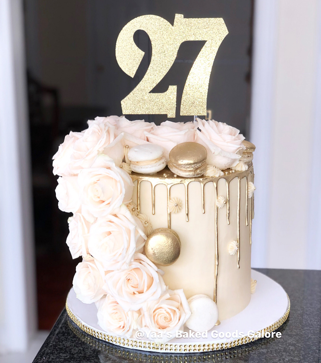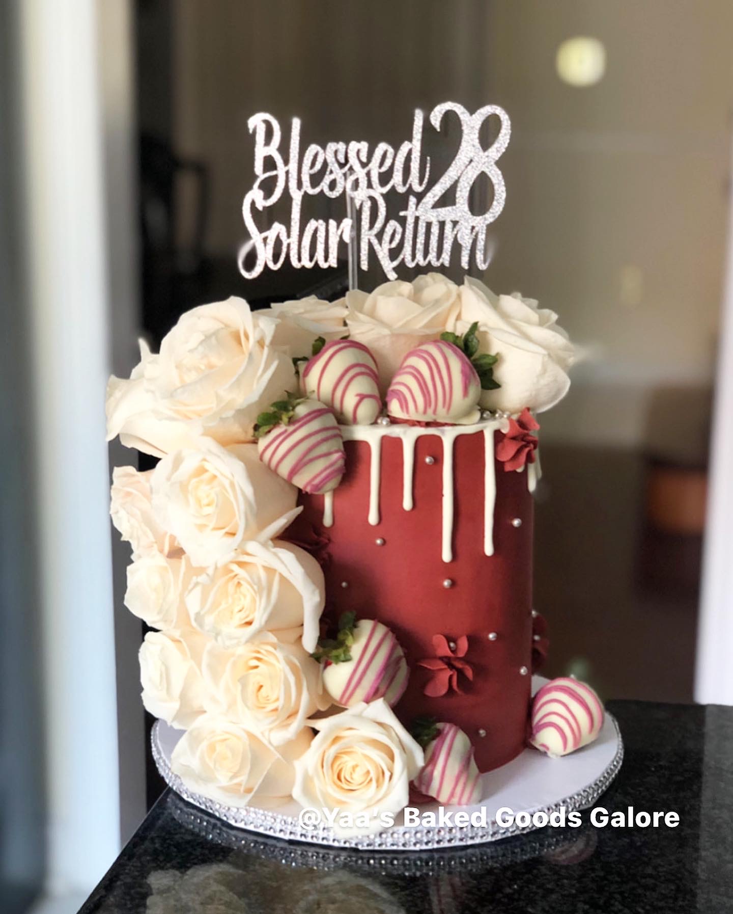 8″ Red velvet signature YBGG design: drip cake with cascading fresh roses and macarons