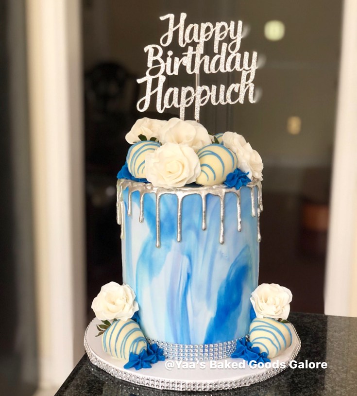 6″ Vanilla signature YBGG design: drip cake with cascading fresh roses and chocolate covered strawberries
