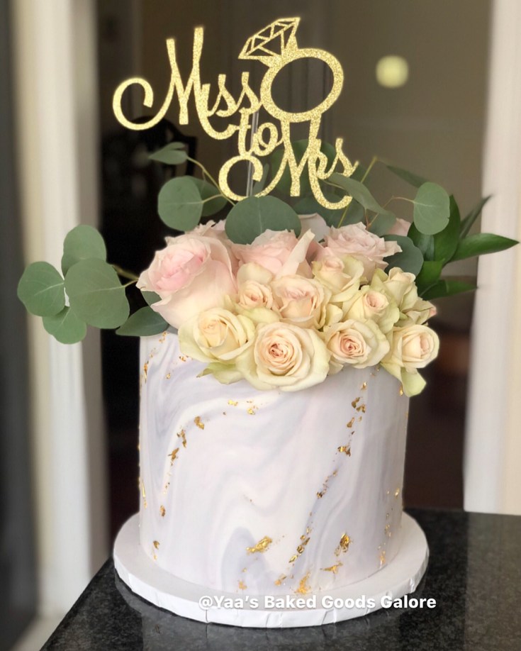 8″ Chocolate marble fondant bridal shower cake with fresh florals and greenery