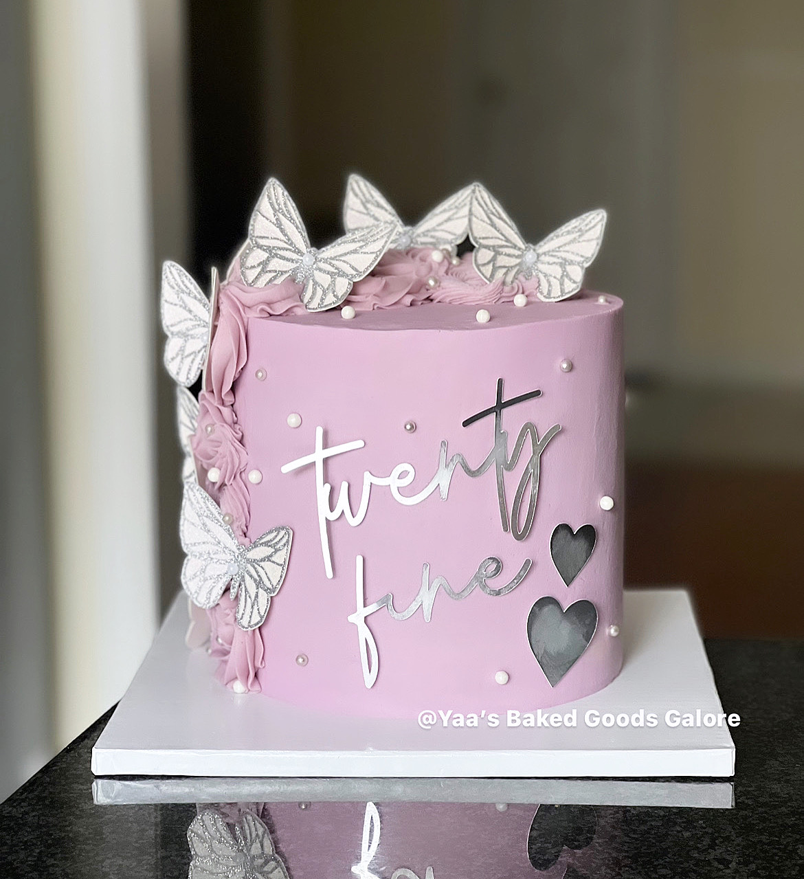 8” Red velvet birthday cake with icing swirls and butterflies