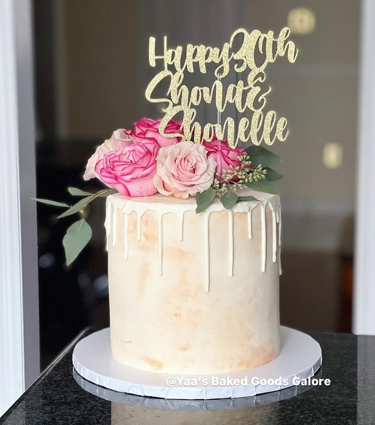 8” Vanilla and Chocolate drip cake with fresh roses and greenery