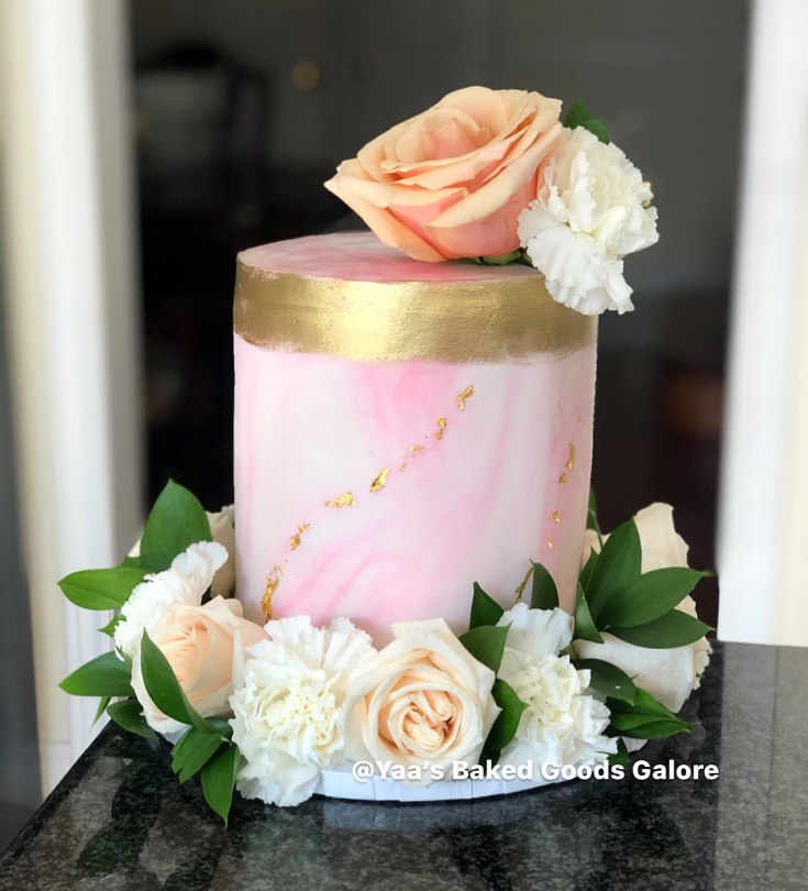 6″ Vanilla and Chocolate marble fondant cake with fresh florals, greenery and hints of edible 24k gold leaf