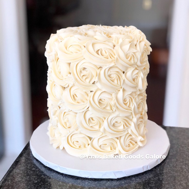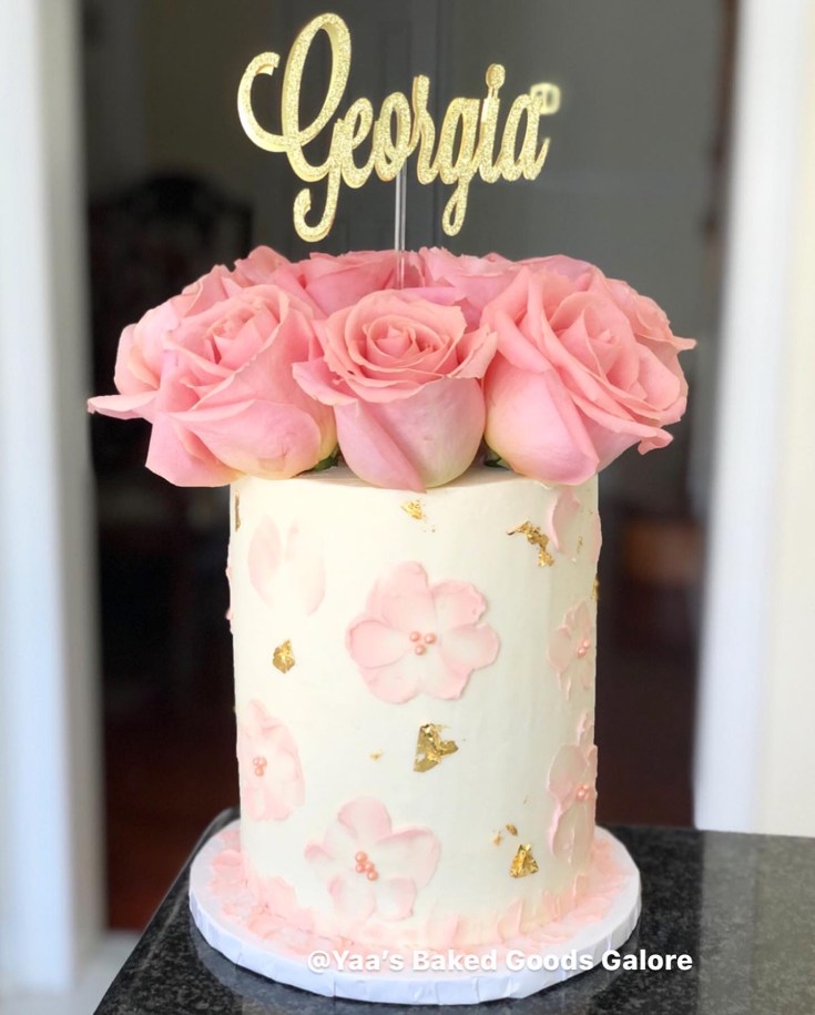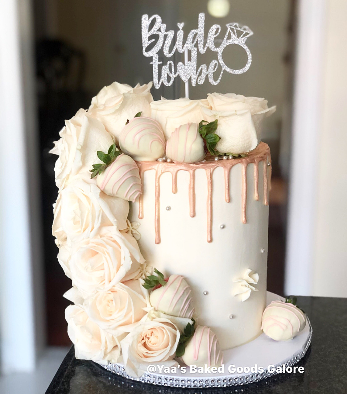 6″ Vanilla signature YBGG design: drip cake with cascading fresh roses and chocolate covered strawberries