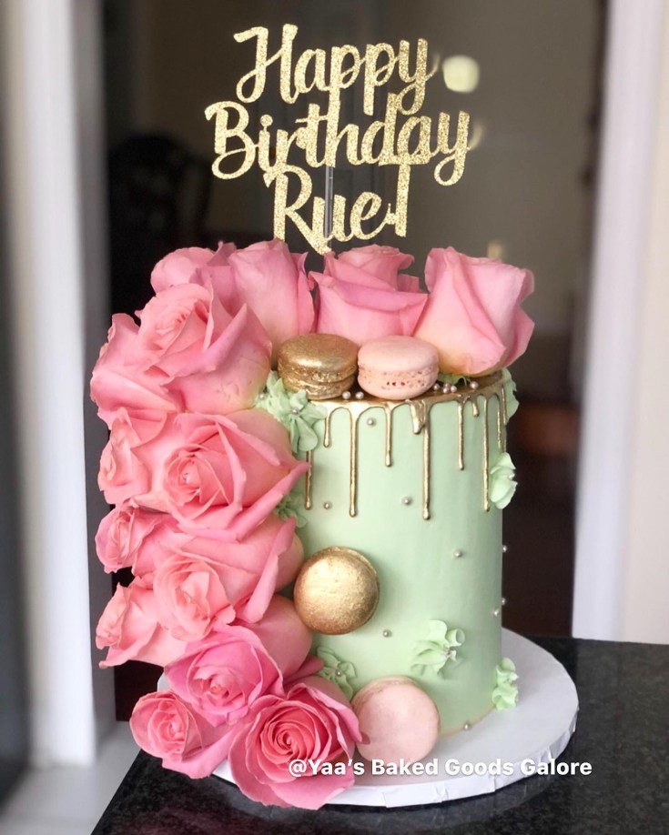 6″ Vanilla and Chocolate signature YBGG design: drip cake with cascading fresh roses and macarons