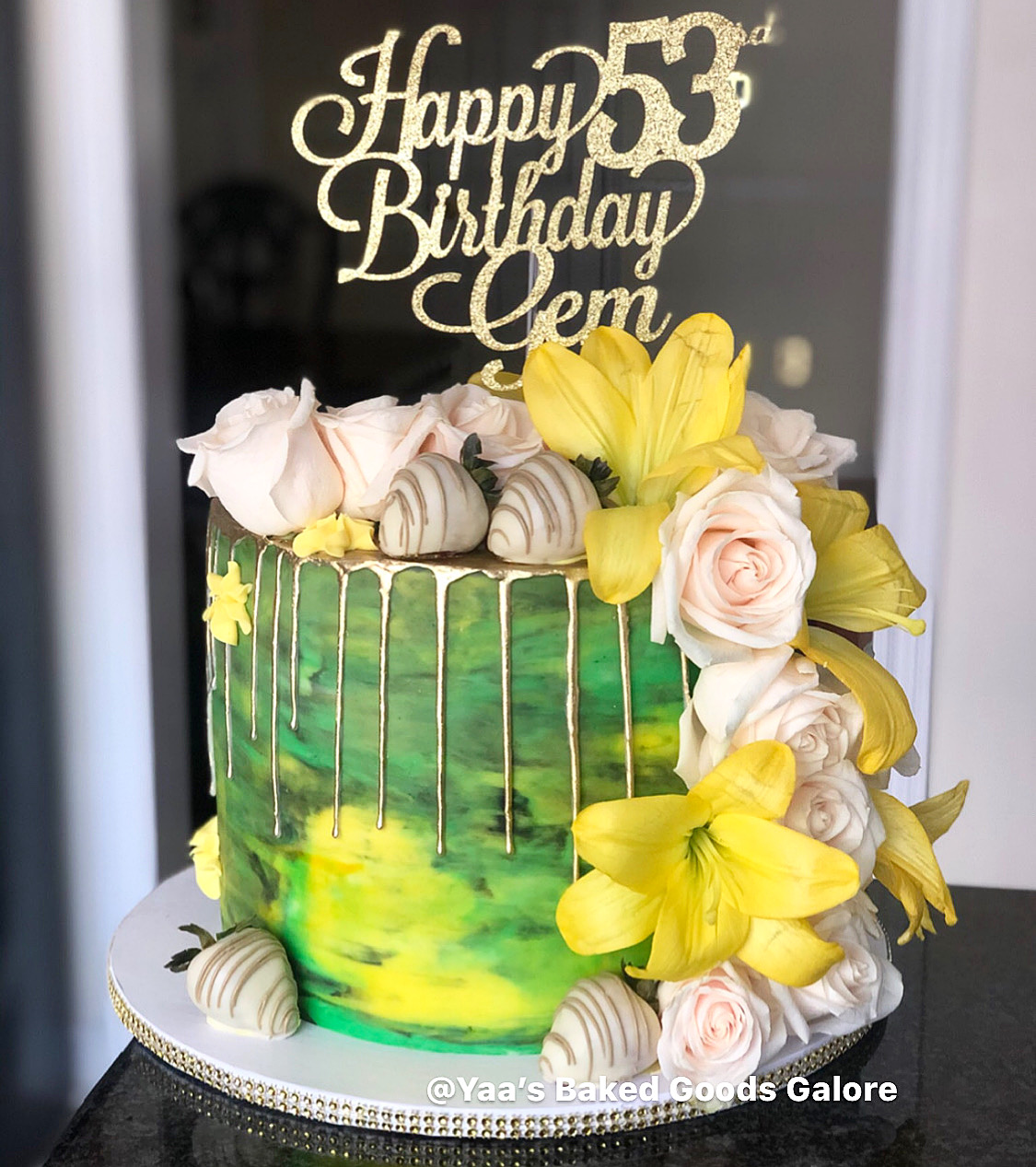 10″ Vanilla drip cake with fresh roses, lilies and chocolate covered strawberries