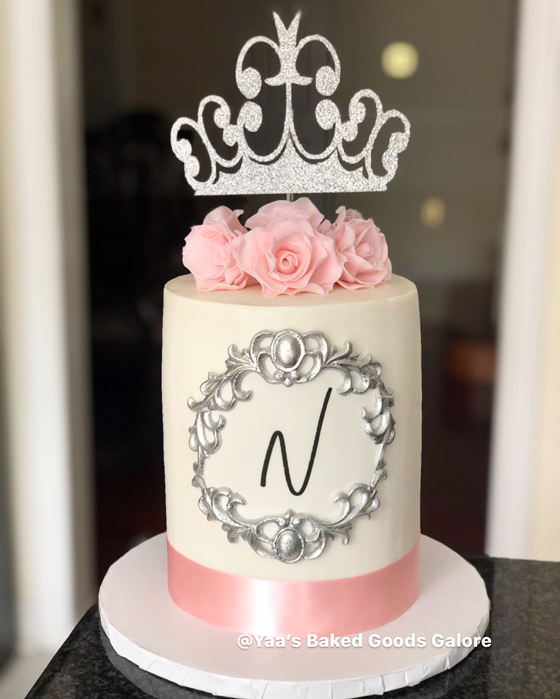 6″ Red Velvet baby shower cake with handmade fondant flowers and our signature frame border with letter