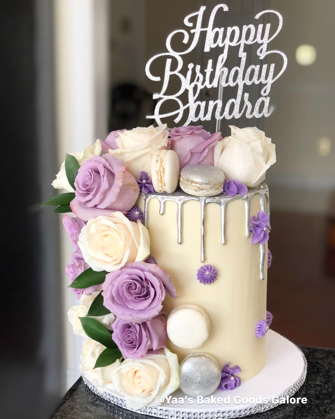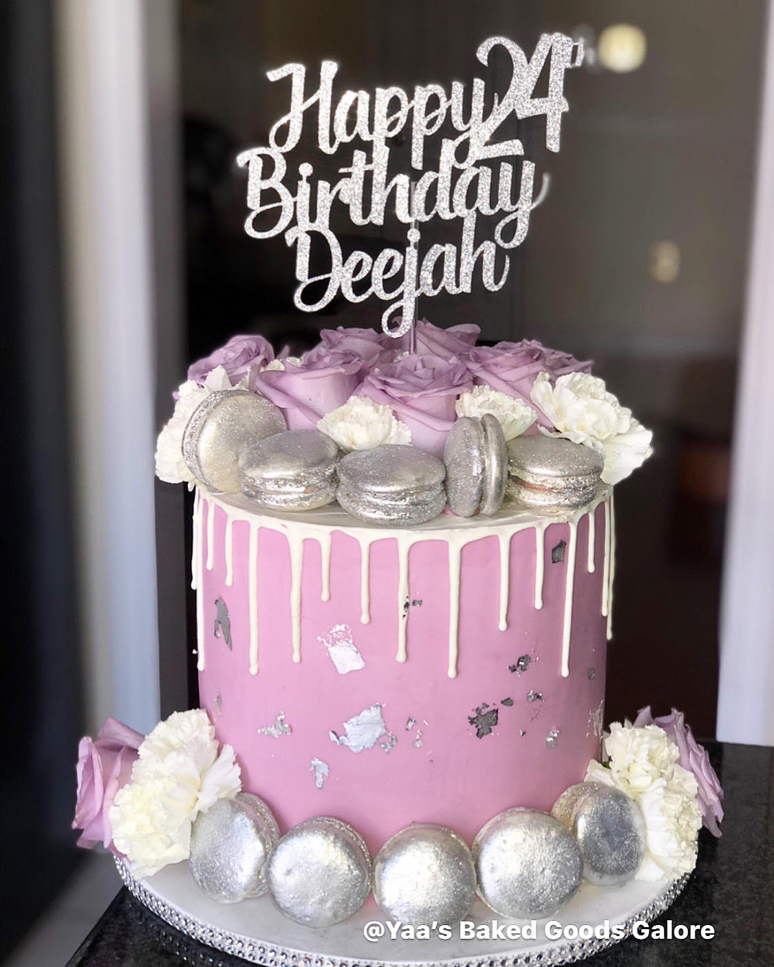 8″ Vanilla and Chocolate drip cake with fresh roses, carnations, macarons and hints of edible silver leaf all over
