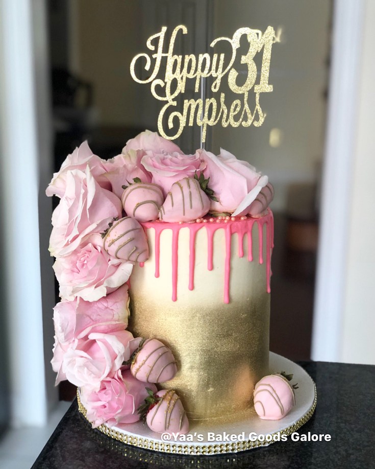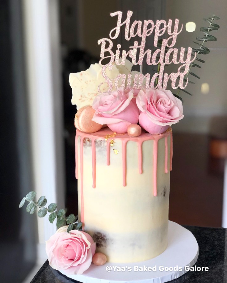 6″ Vanilla signature YBGG design: drip cake with cascading fresh roses and macarons
