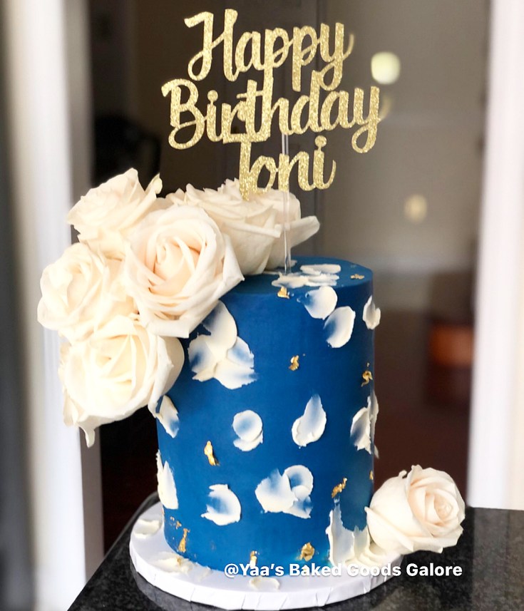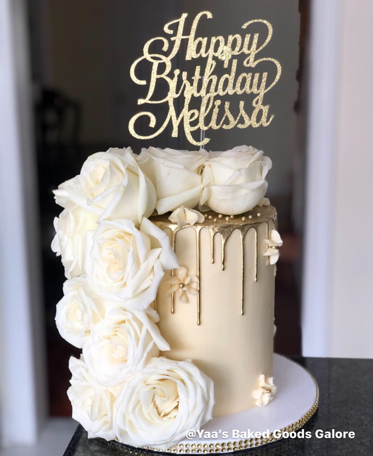 6″ Vanilla signature YBGG design: cascading fresh roses and macarons