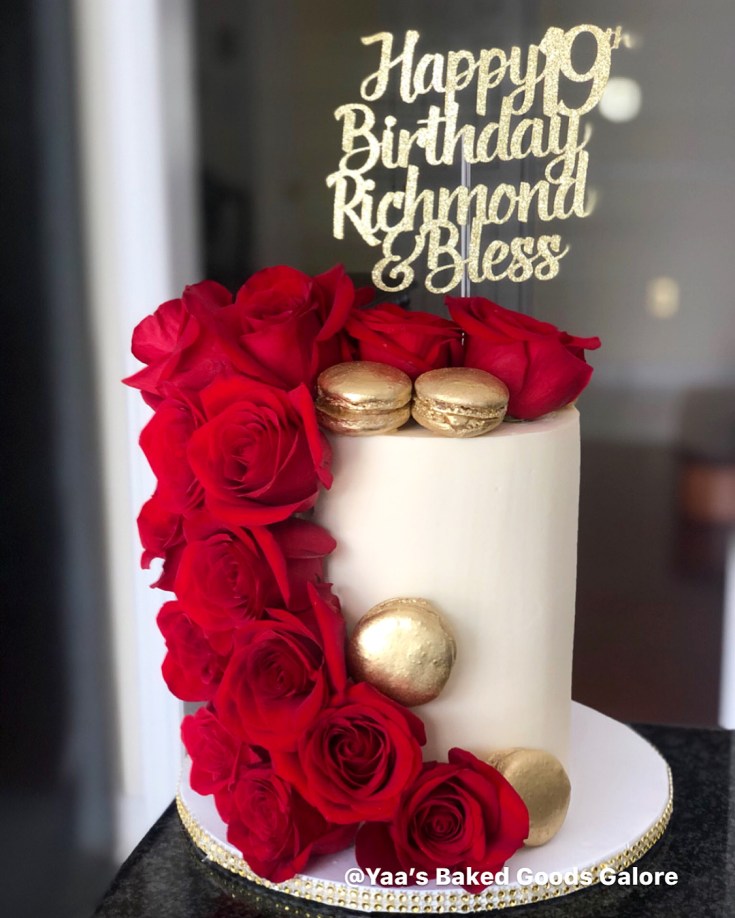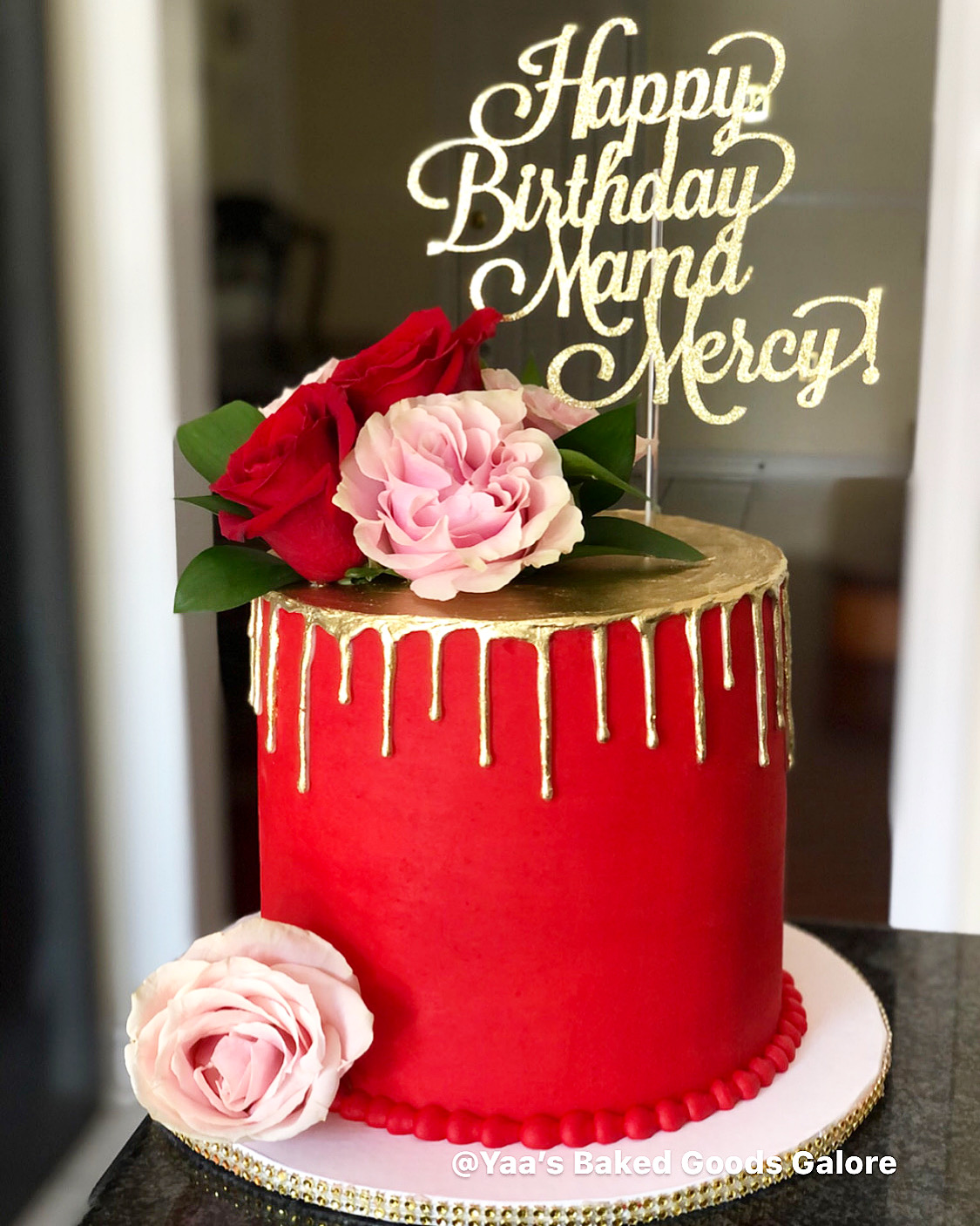 6″ Red velvet textured icing cake with fresh roses and hints of edible 24k gold leaf