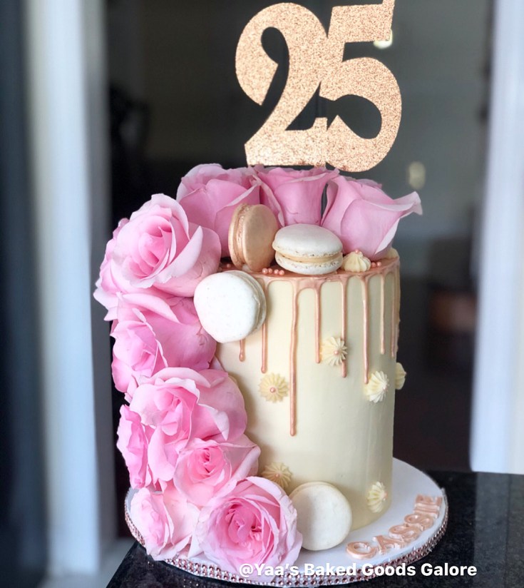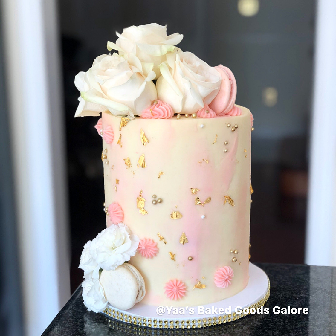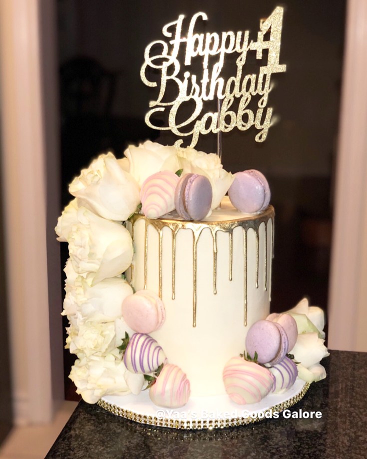 6″ Vanilla drip cake with fresh roses, chocolate covered strawberries and macarons