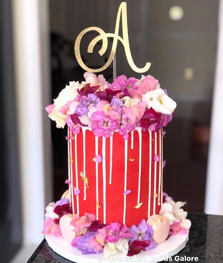 6″ Red Velvet drip cake with fresh florals, macarons and hints of 24k gold