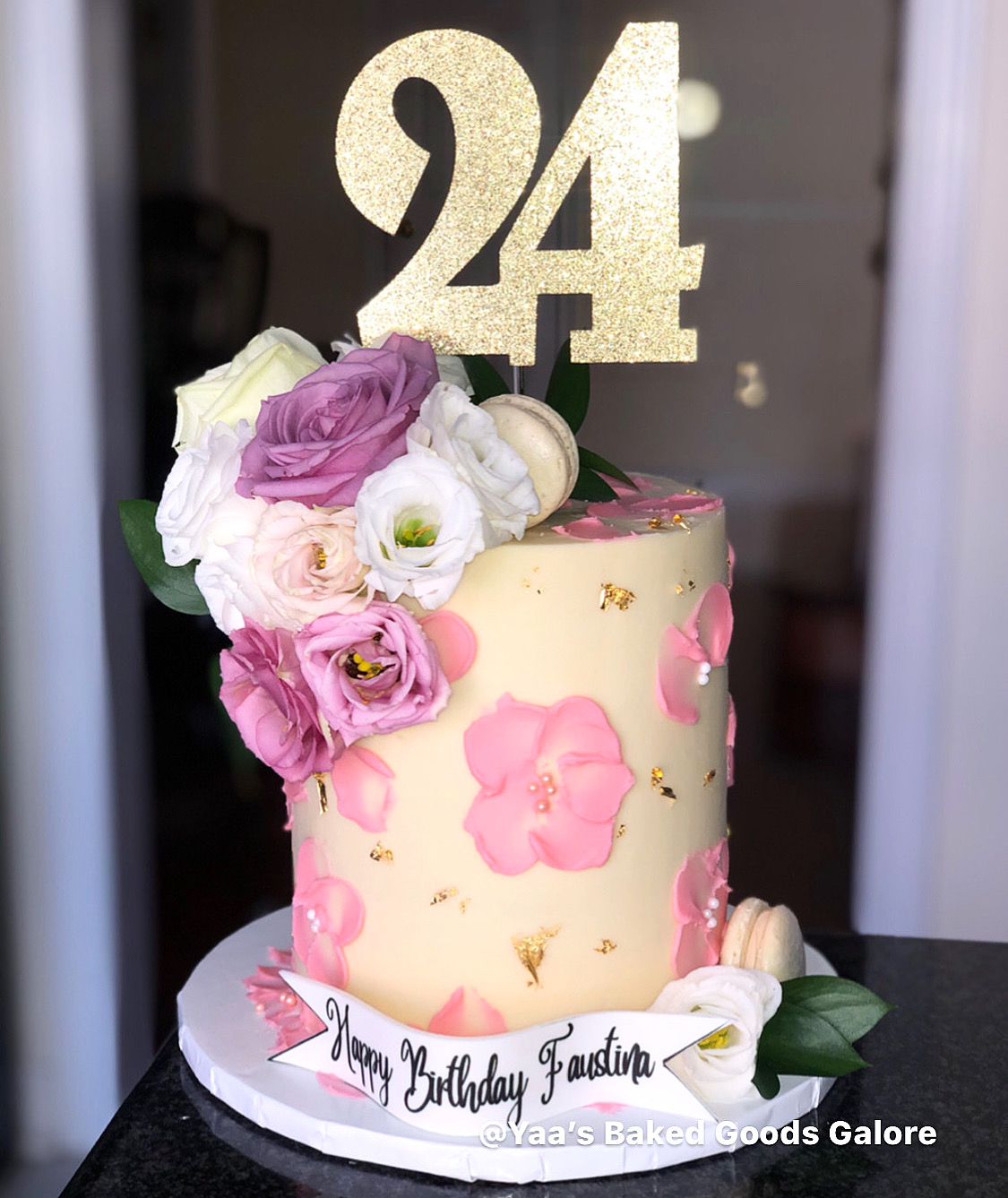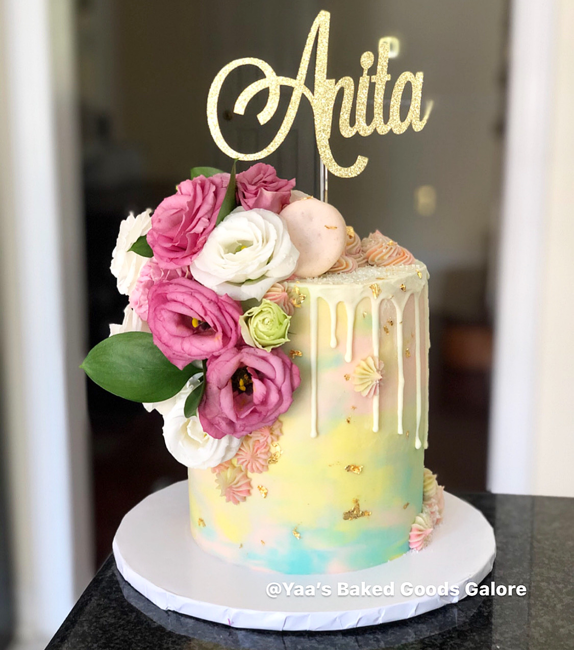 6″ Vanilla tie dye drip cake with fresh florals, edible 24k gold and macarons