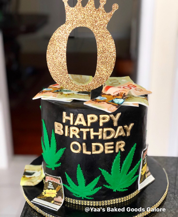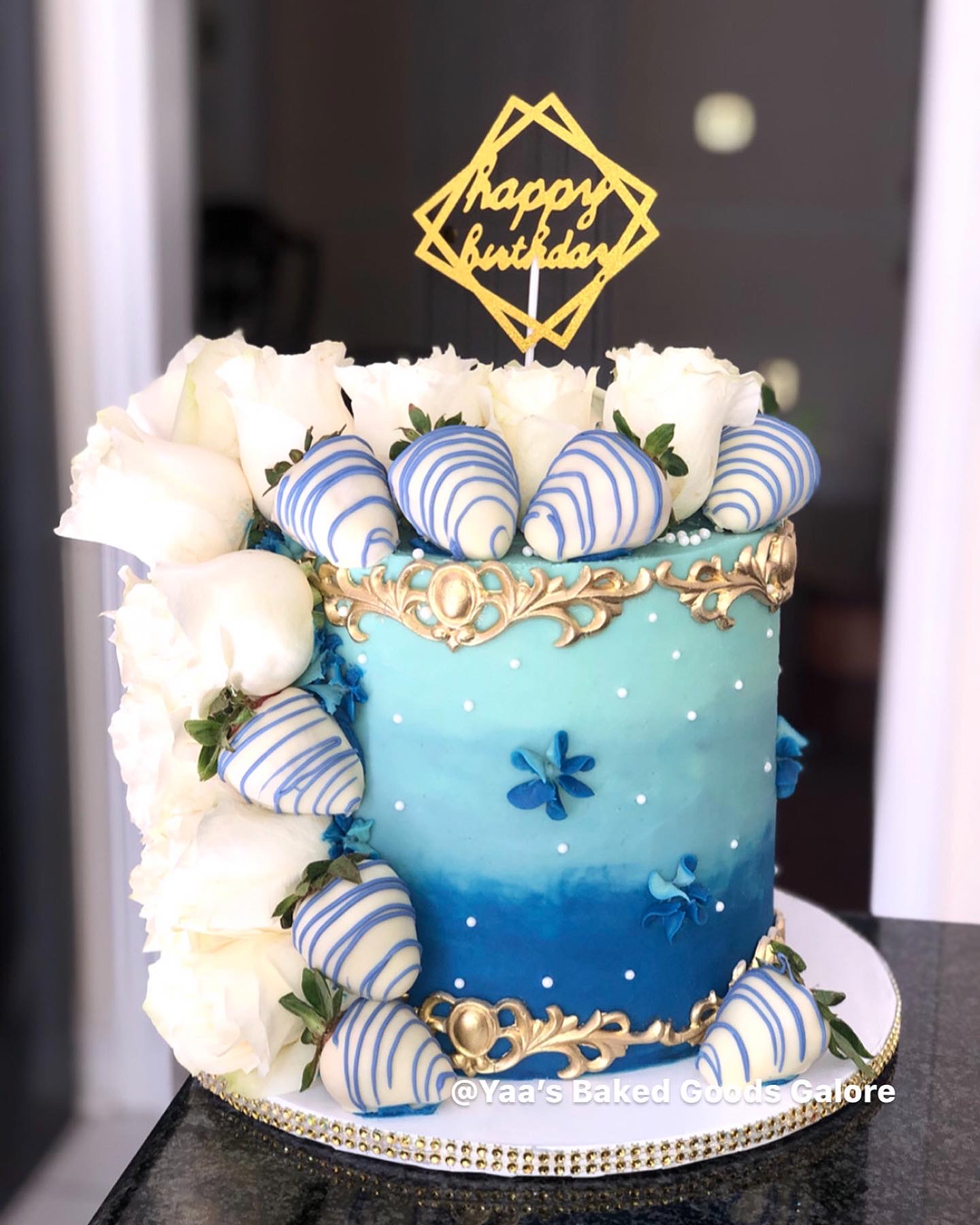 8″ Marble Vanilla and Chocolate ombre design cake with fresh roses, chocolate covered strawberries, gold fondant details and a SURPRISE! MONEY cake feature