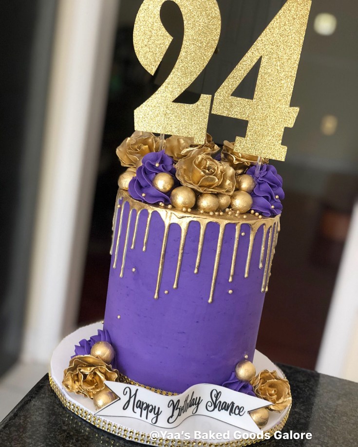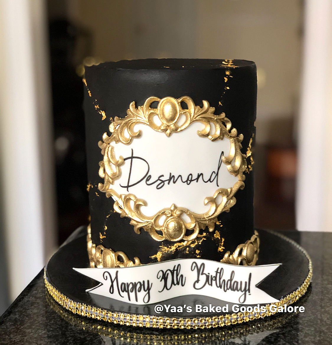 6″ Red Velvet and Vanilla fondant birthday cake with a signature, hand painted gold borders and hints of edible 24k gold leaf all over