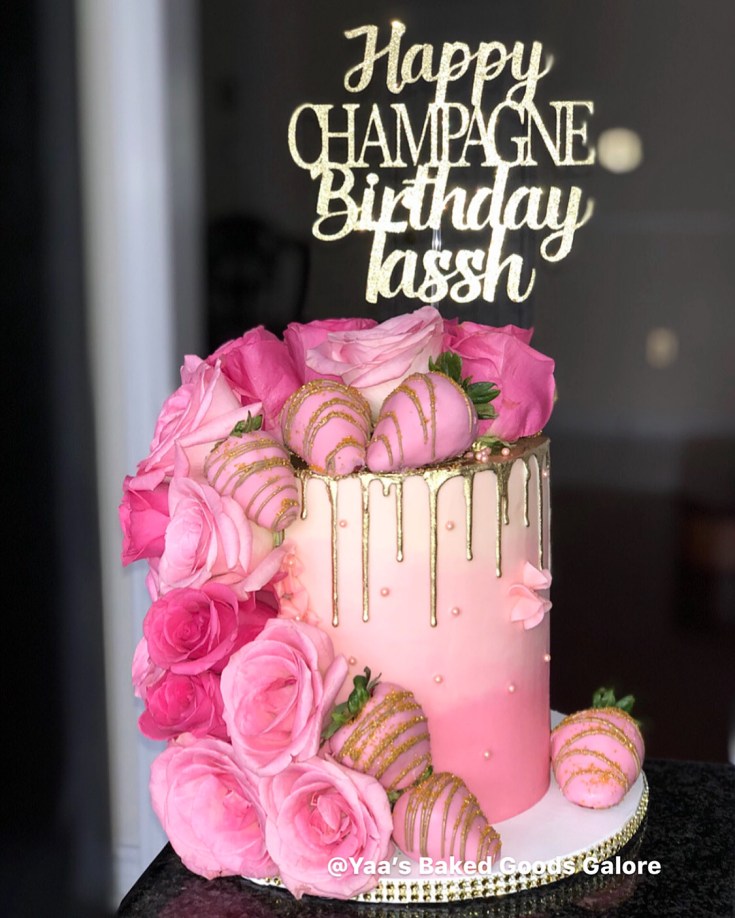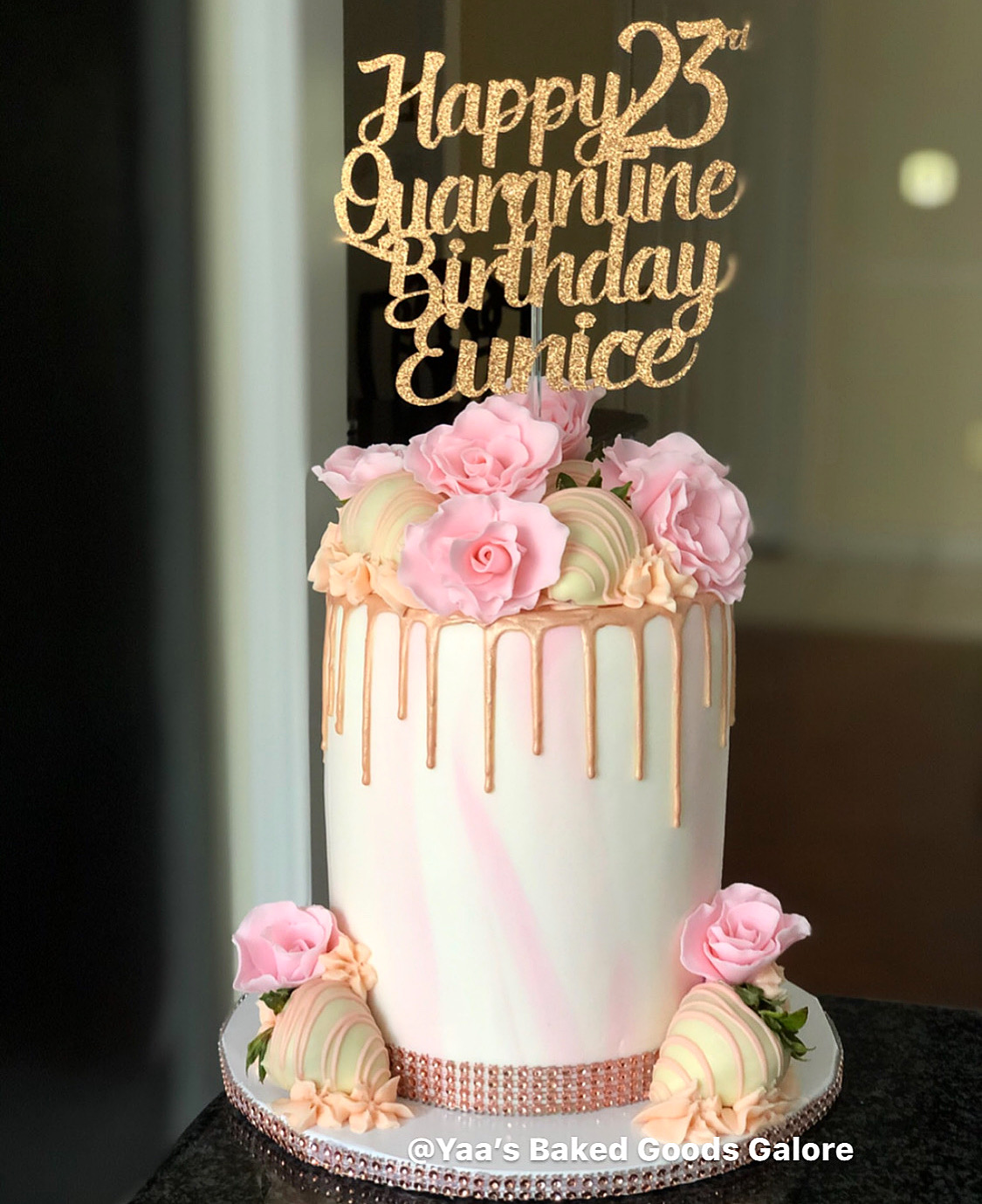 6″ Vanilla signature YBGG design: drip cake with cascading fresh roses and chocolate covered strawberries