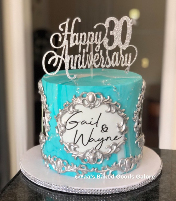 8″ Vanilla and Chocolate marble fondant anniversary cake with a signature, pictures of the couple around the cake, hand painted silver borders and hints of edible sliver leaf all over