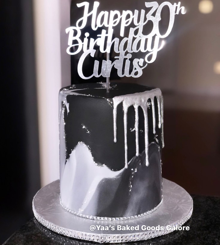 6″ Vanilla and Red Velvet marble fondant drip cake with handmade fondant flowers & chocolate covered strawberries