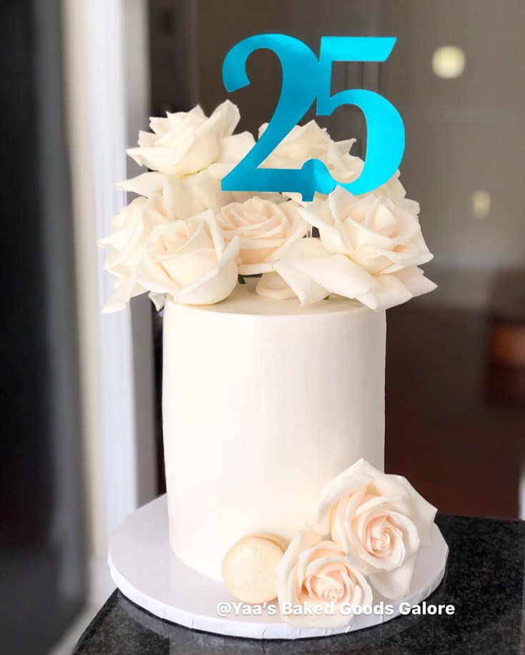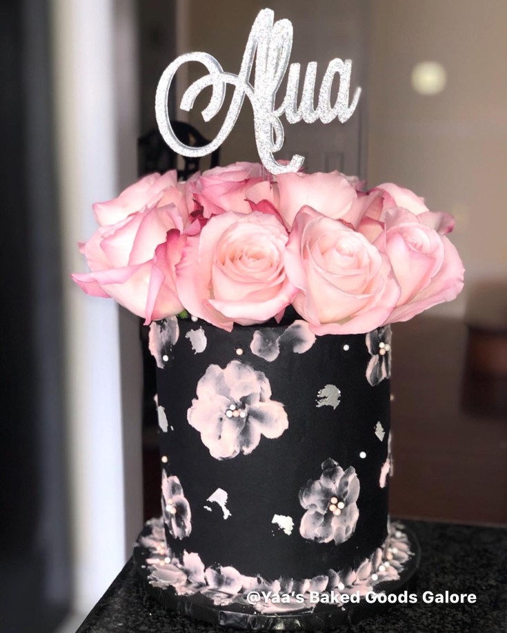 6″ Vanilla floral design birthday cake with fresh roses and hints of edible silver leaf