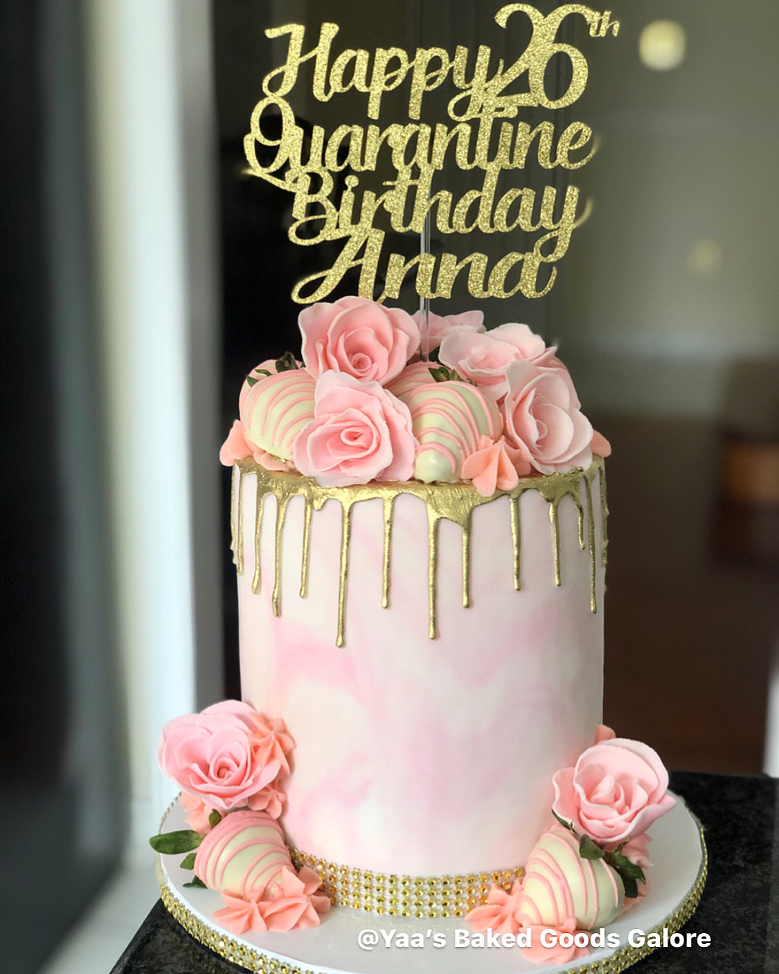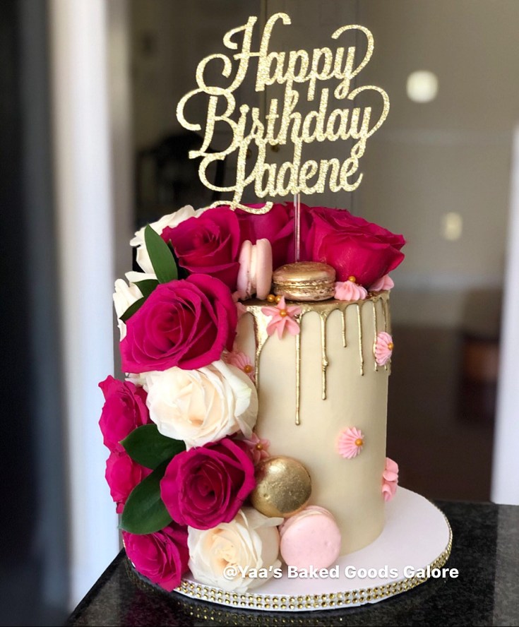 6″ Red Velvet signature YBGG design: drip cake with cascading fresh roses and macarons
