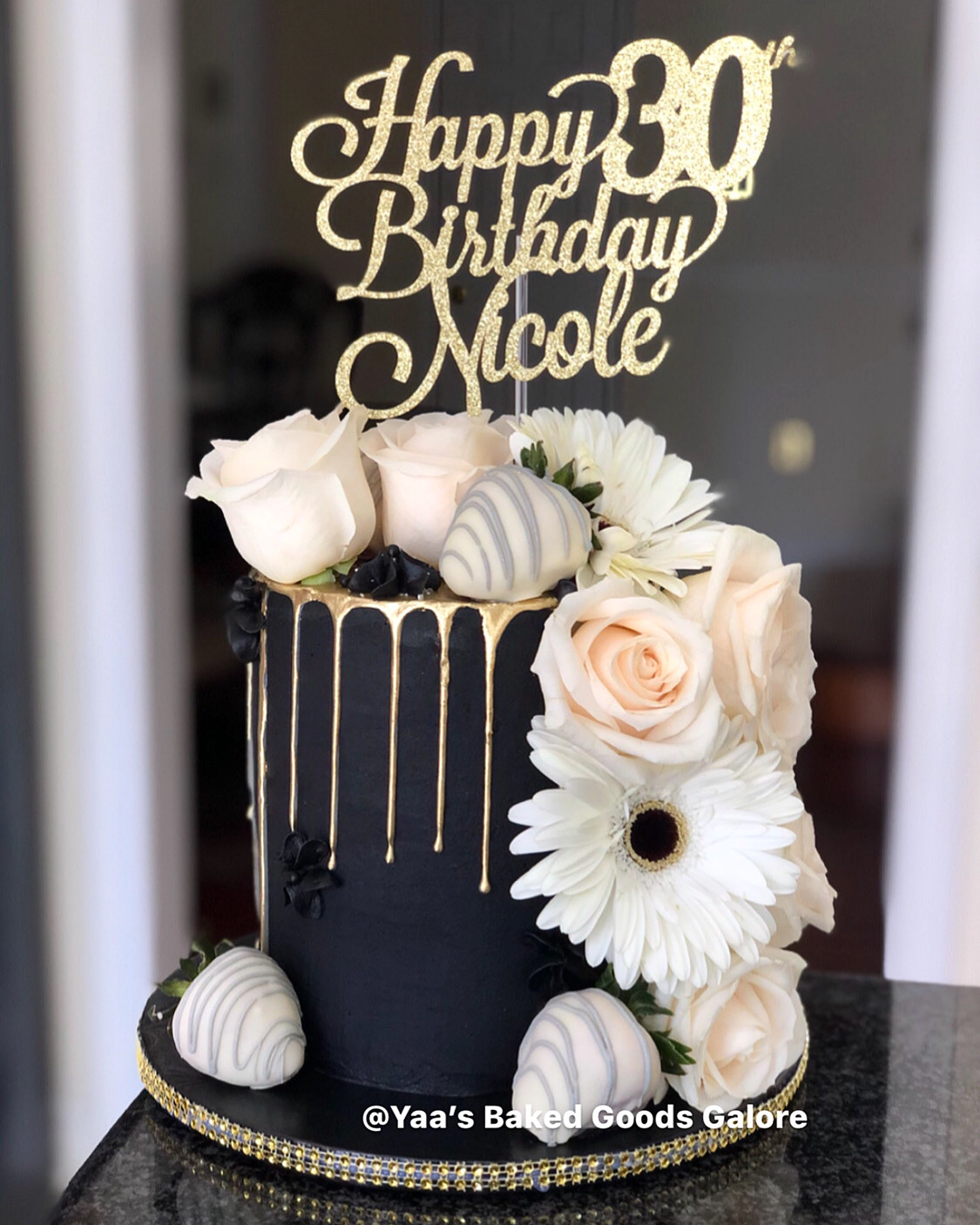 6″ Vanilla drip cake with fresh florals and chocolate covered strawberries