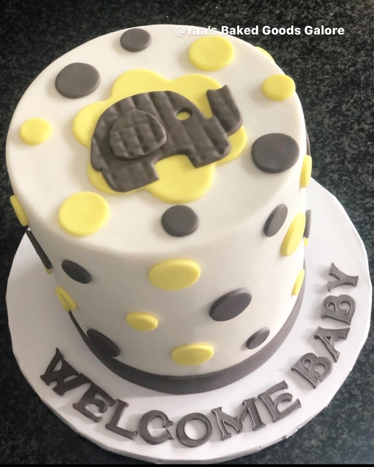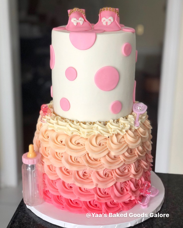 6″ + 8″ Baby shower cake featuring rosettes, handmade fondant baby shoes & more