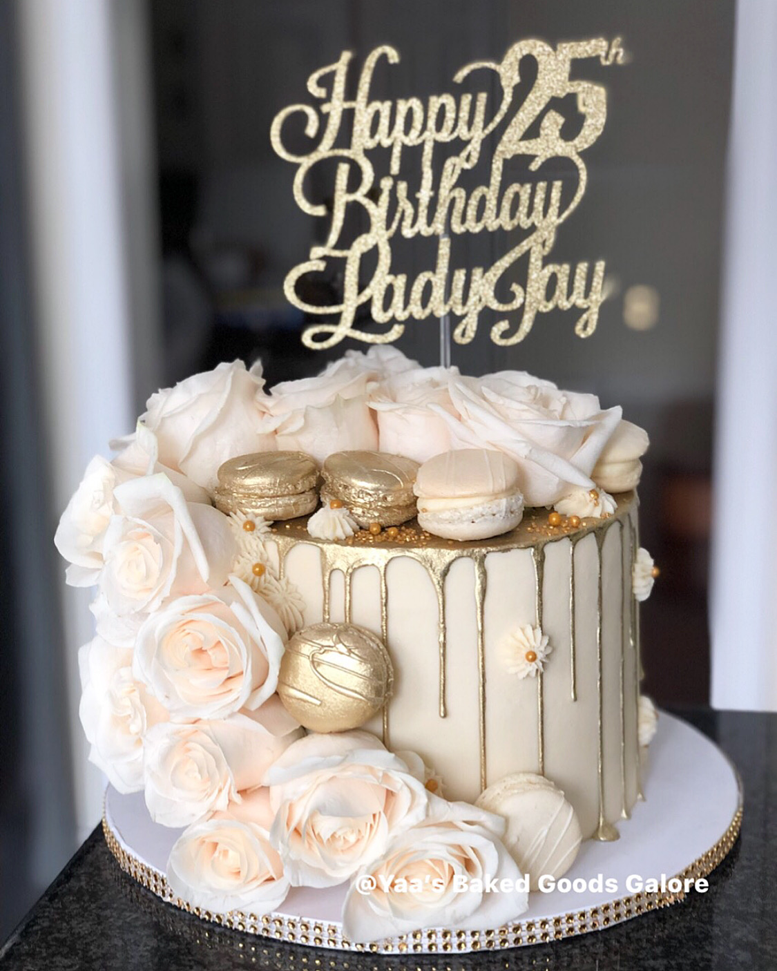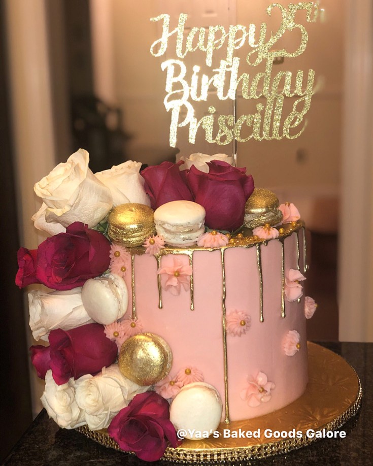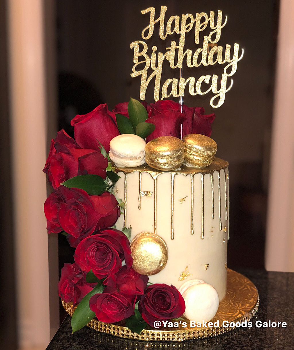 8″ Red Velvet signature YBGG design: drip cake with cascading fresh roses and macarons