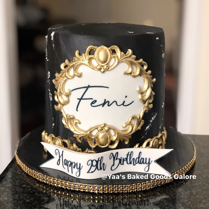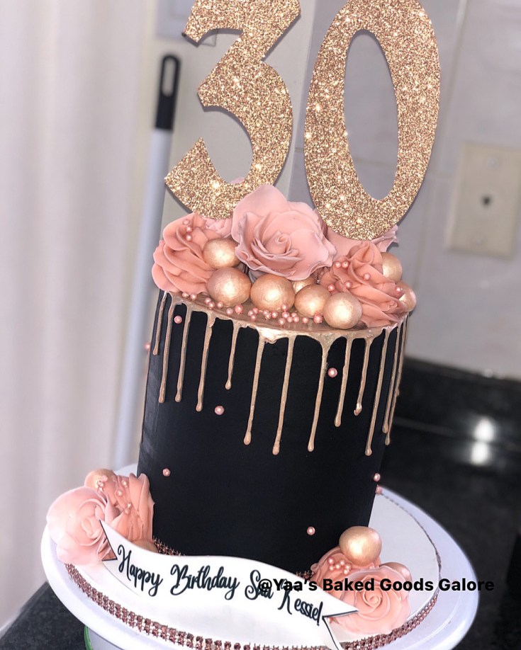 6″ Vanilla and Red Velvet Rose gold + black drip cake with handmade fondant flowers, balls and swirls
