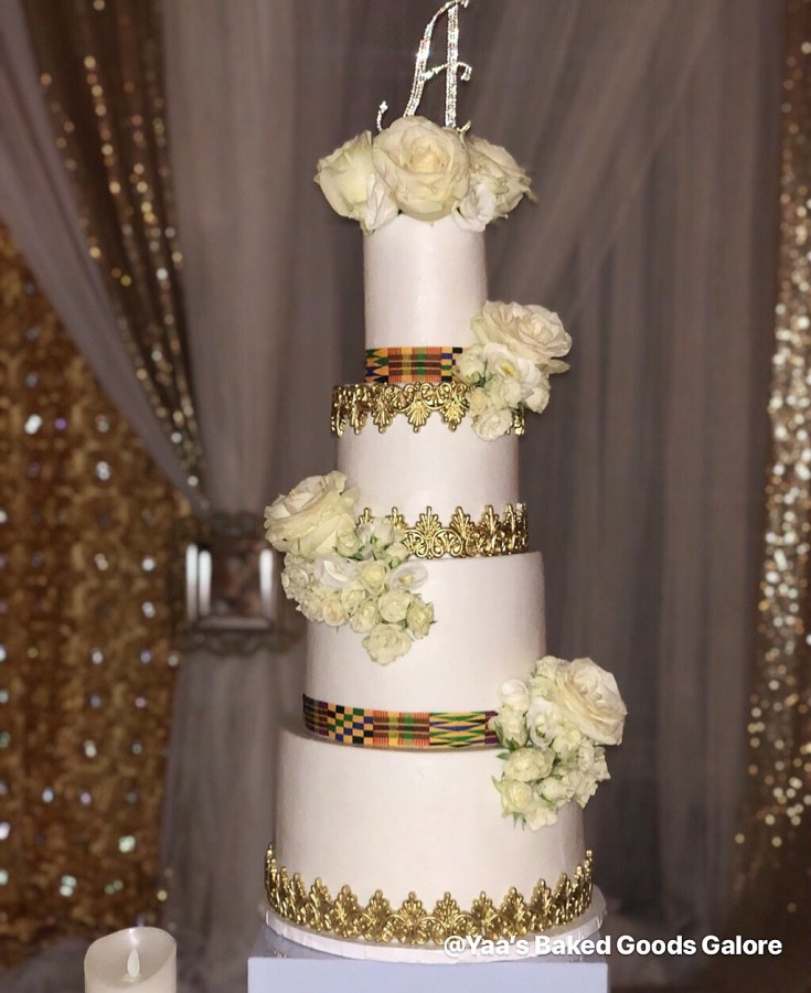 4″ + 6″ + 8″ + 10″ 4 tier all fondant birthday cake with fresh florals and kente print