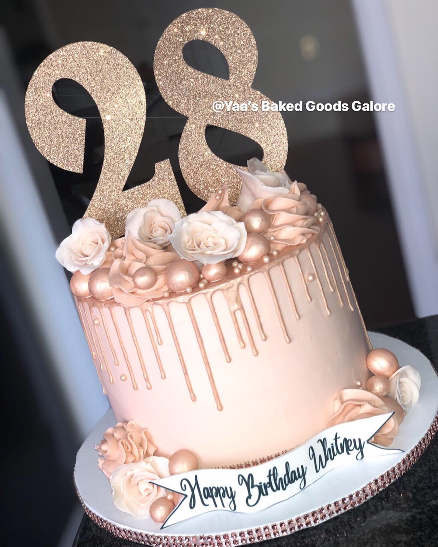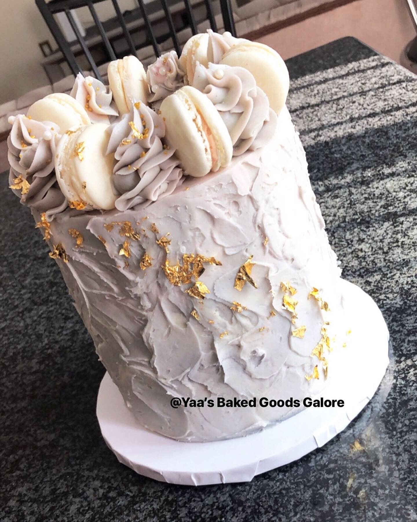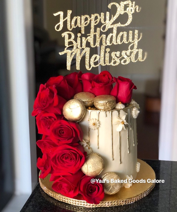 6″ Vanilla drip cake with fresh roses & macarons