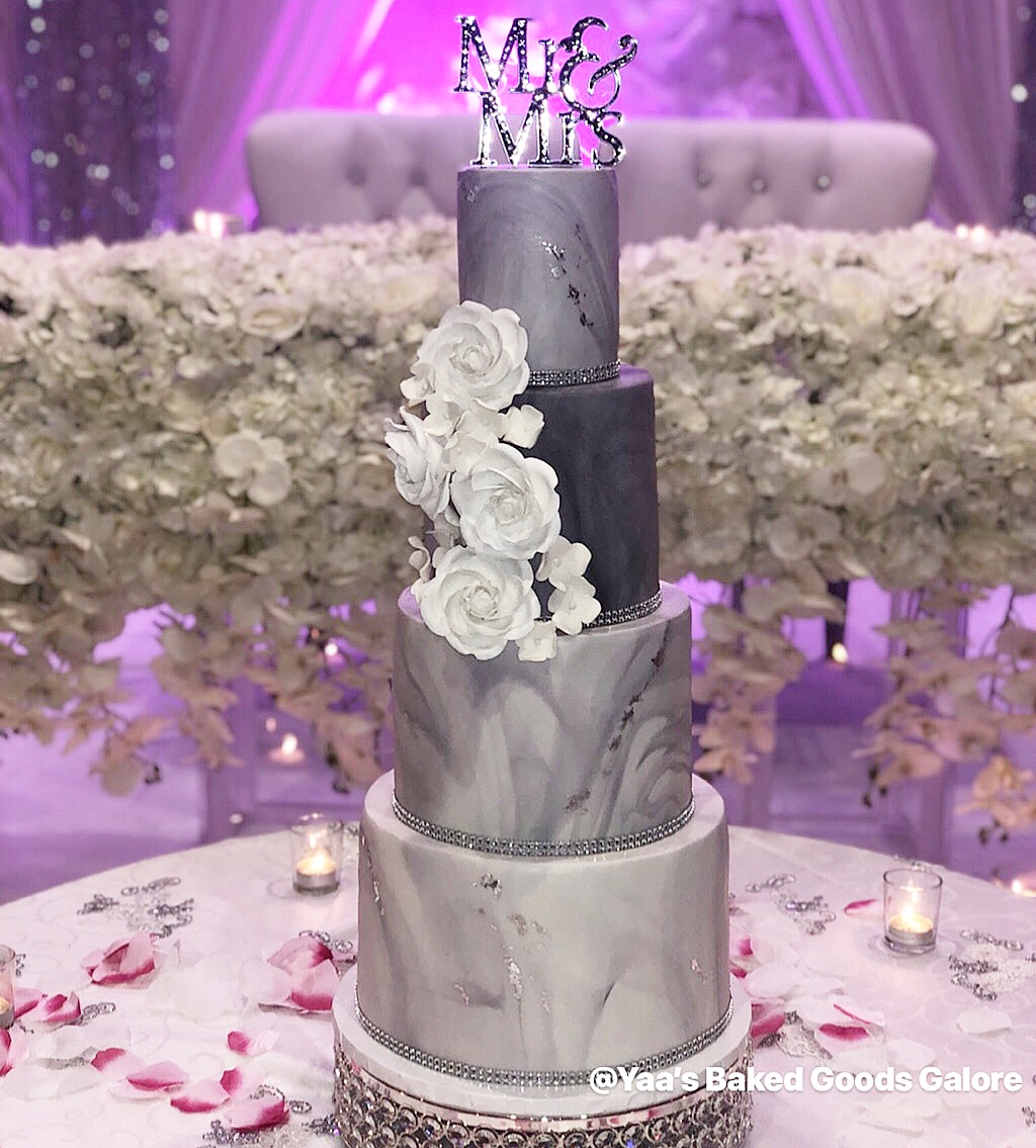 4″ + 6″ + 8″ + 10″ 4 tier Wedding cake with marble fondant, edible silver leaf and gum paste flowers