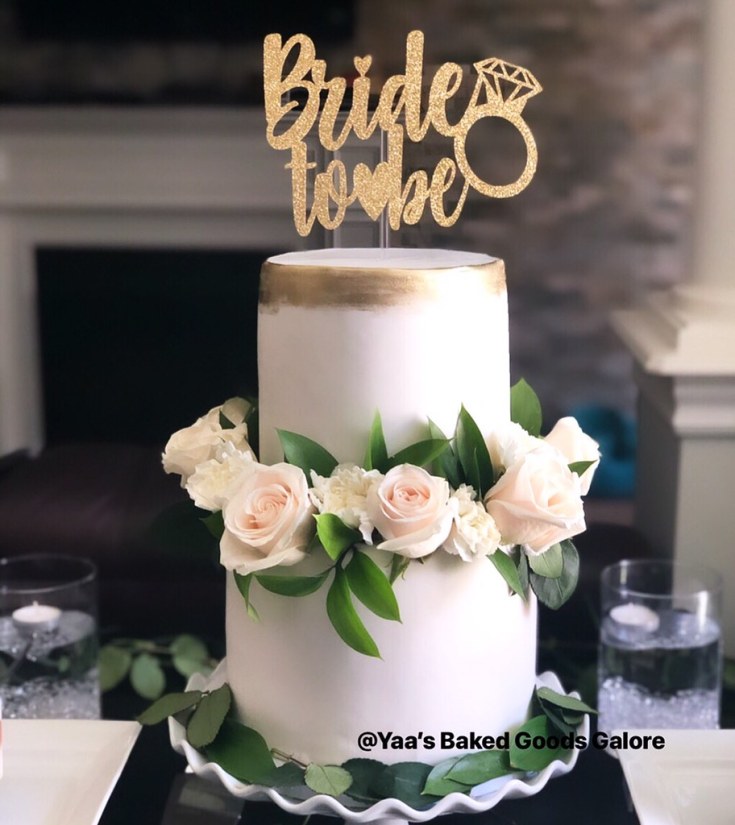 6″ + 8″ Marble Vanilla and Chocolate 2 tier bridal shower cake with fresh roses, greenery and stripe of gold
