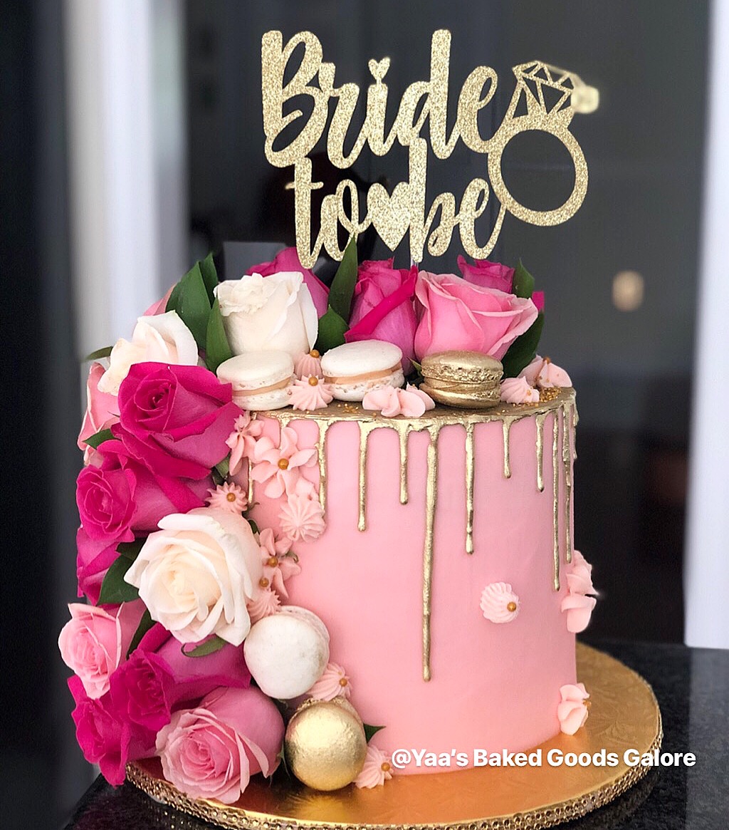 8″ 4 layer Red velvet drip cake with fresh roses and macarons for a bridal shower