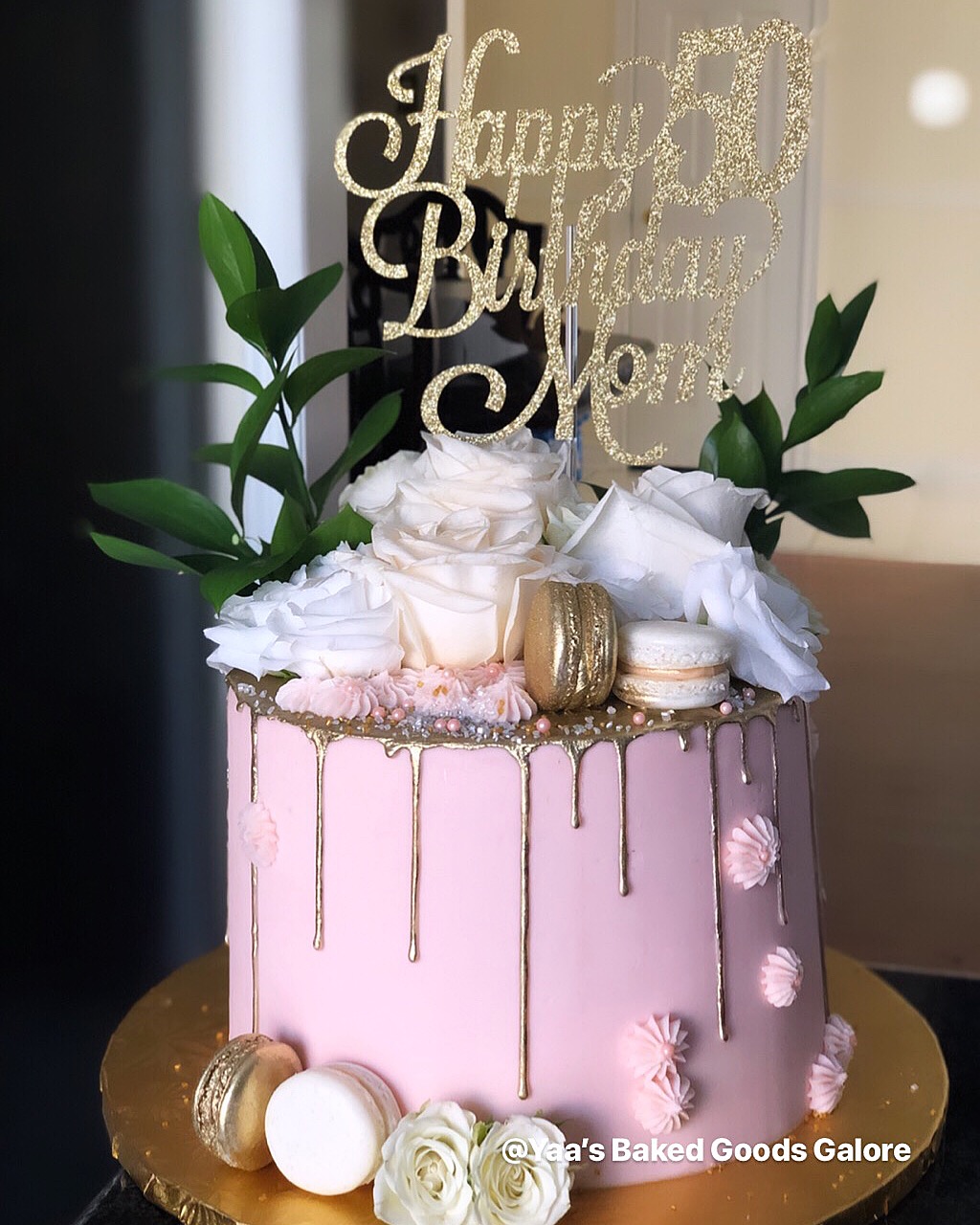 6″ Vanilla semi-naked drip cake with fresh roses, macarons and edible 24k gold