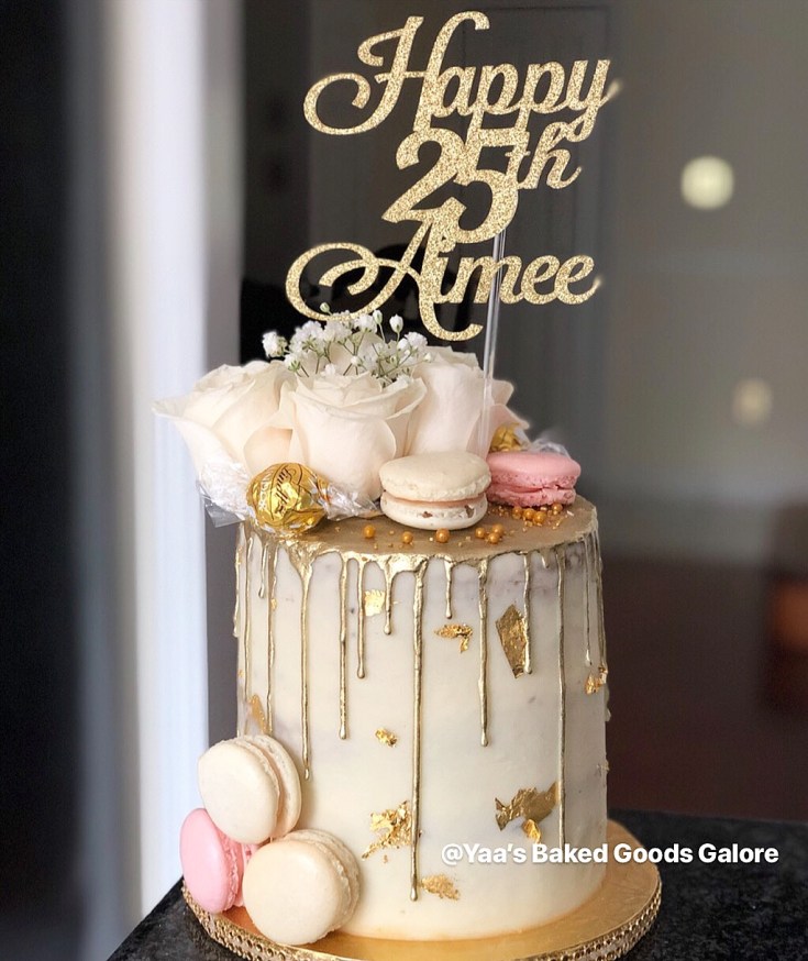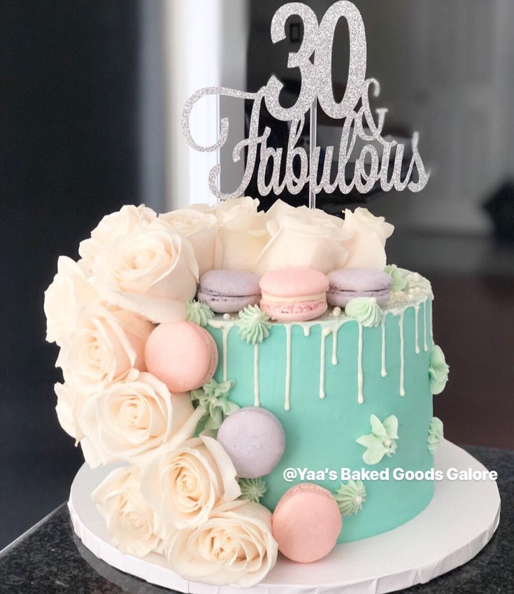 8″ Coconut drip birthday cake with fresh florals and macarons