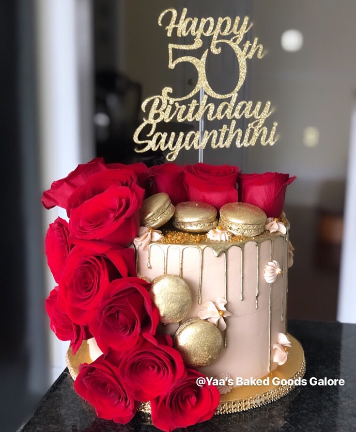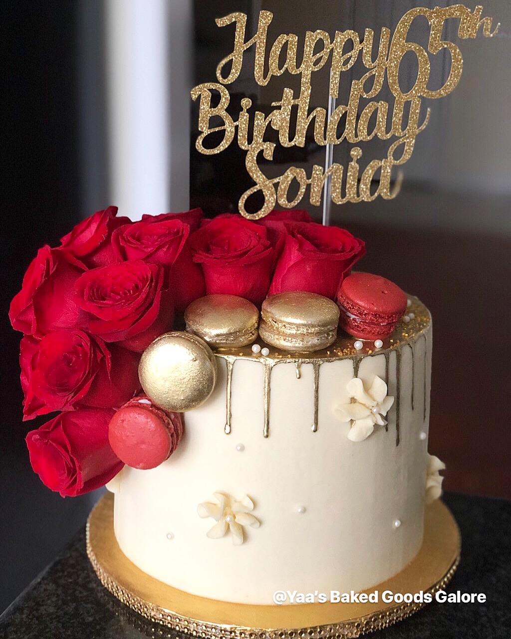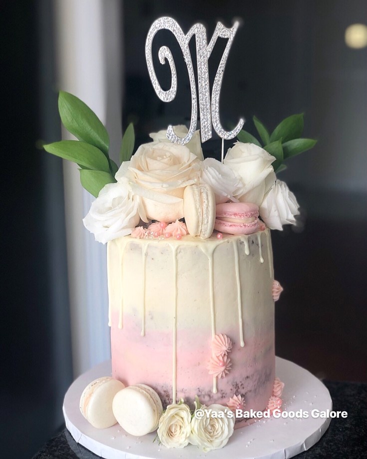 8″ Vanila semi-naked drip cake with fresh roses and macarons