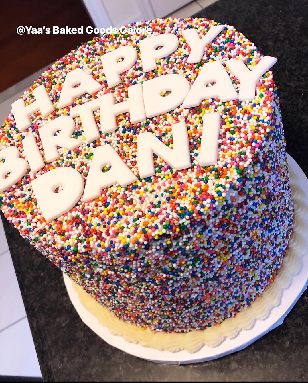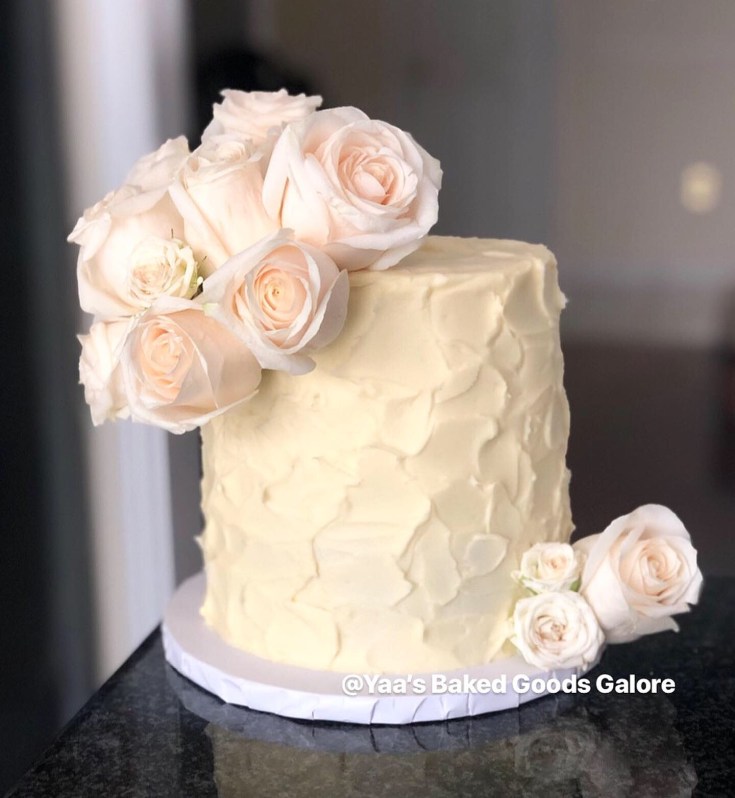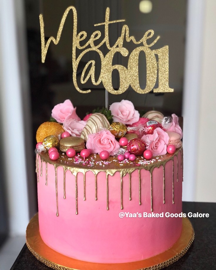 6″ Semi naked Vanilla drip cake with fresh flowers and macarons