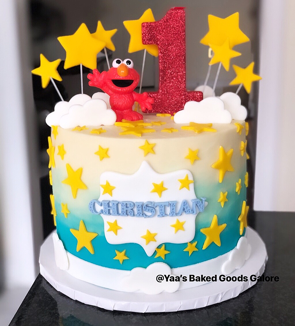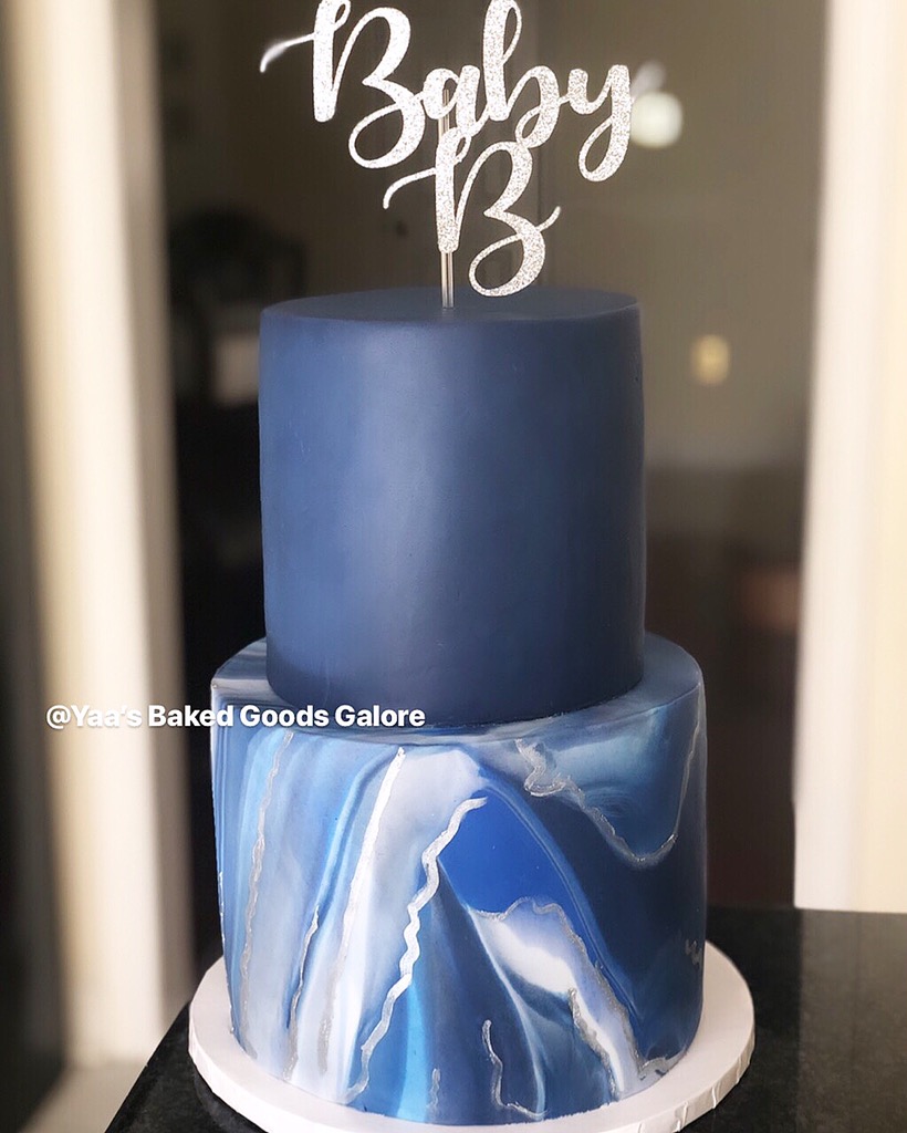 6″ + 8″ Vanilla and red velvet baby shower cake featuring marbled fondant