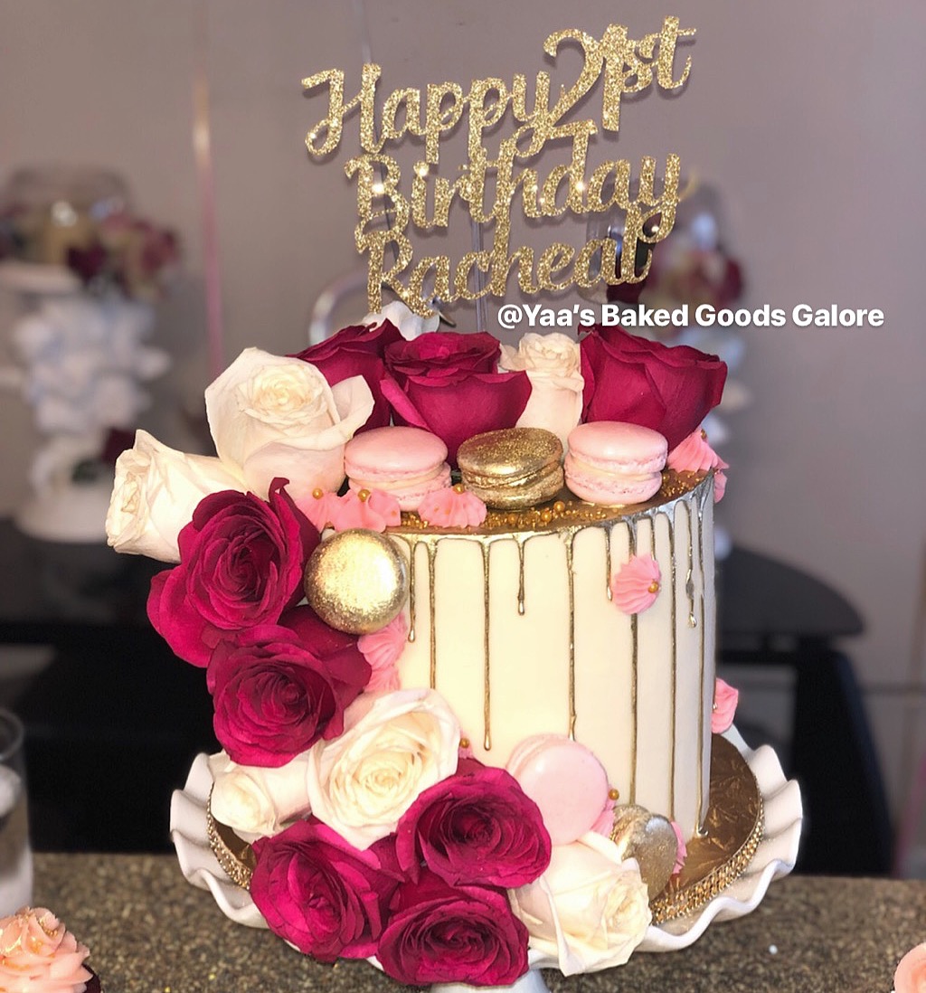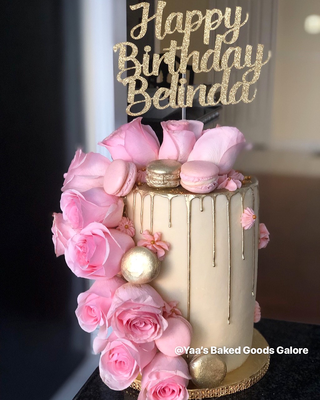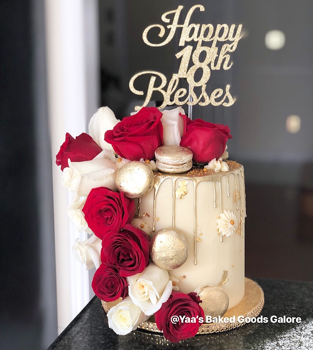 8″ Vanilla Drip cake w/ fresh roses & macarons