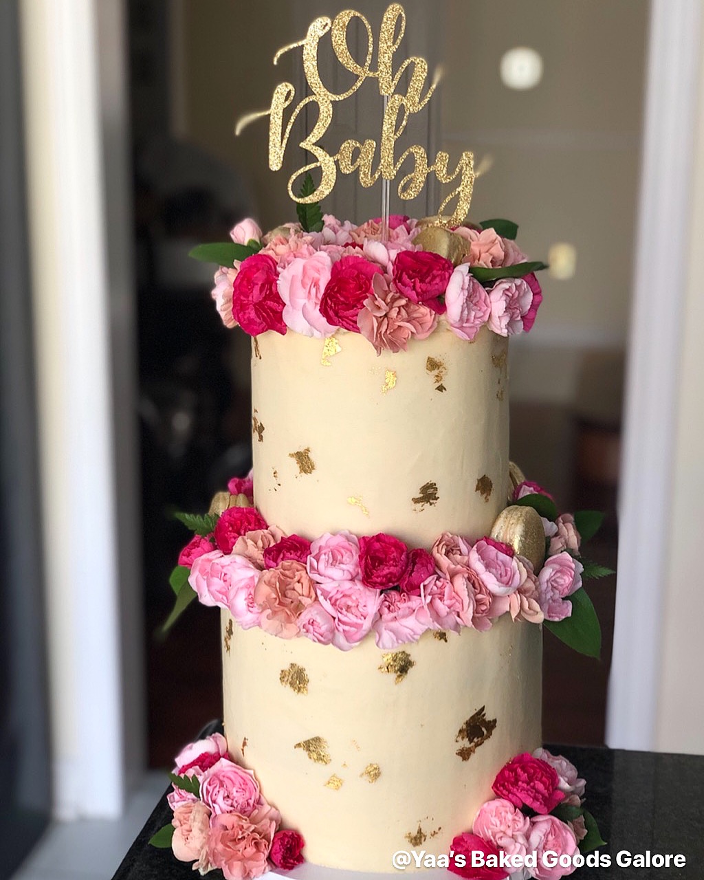 6″ + 8″ 2 tier Vanilla baby shower cake w/ fresh carnations & macarons
