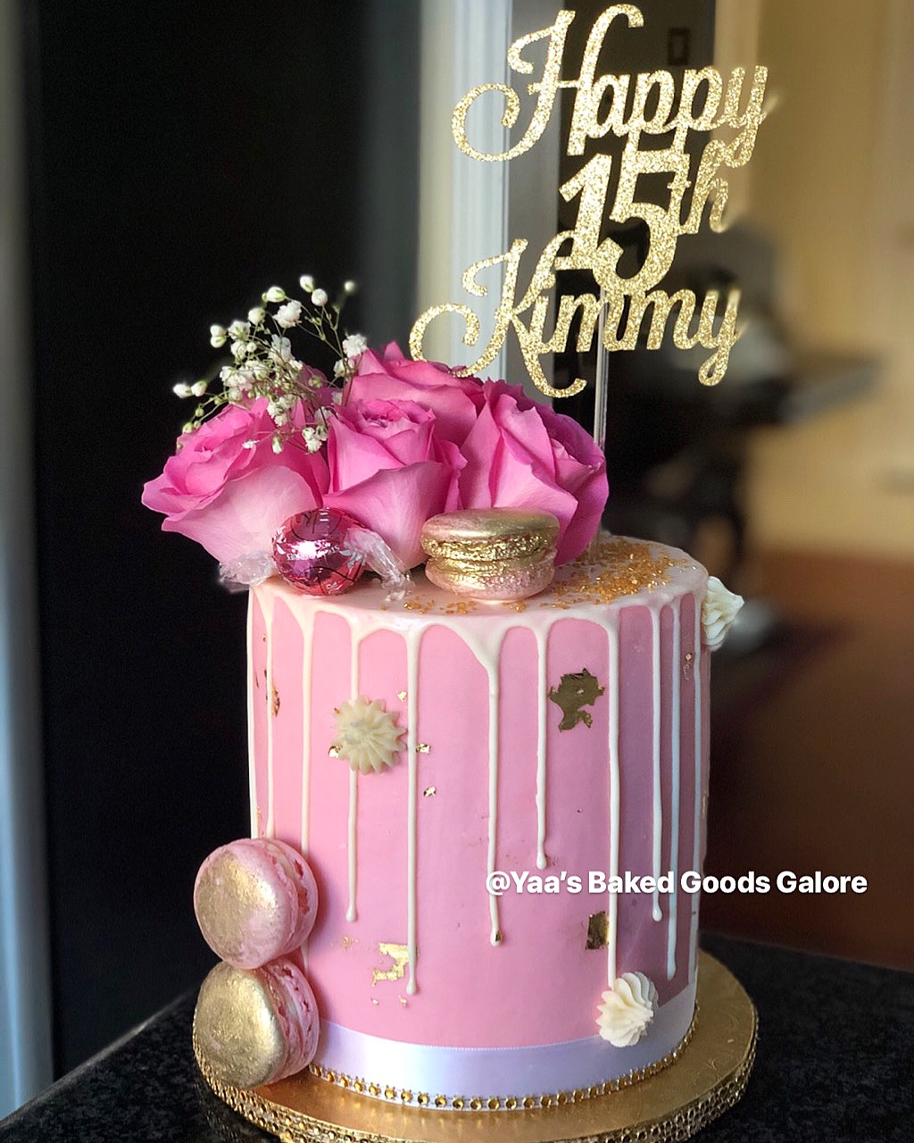 6″ drip cake w/ fresh roses, Lindt balls & macarons