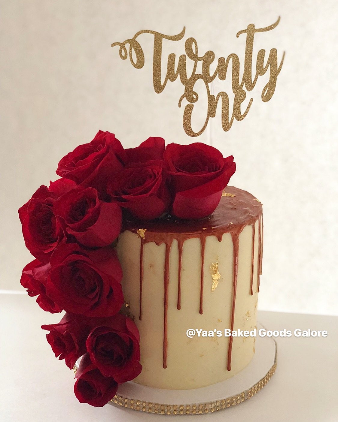 8″ Red velvet drip cake w/ fresh roses and macarons