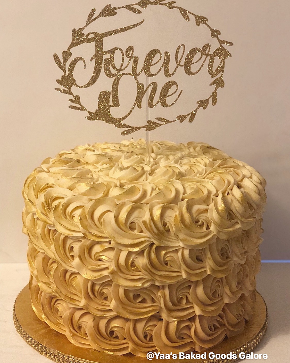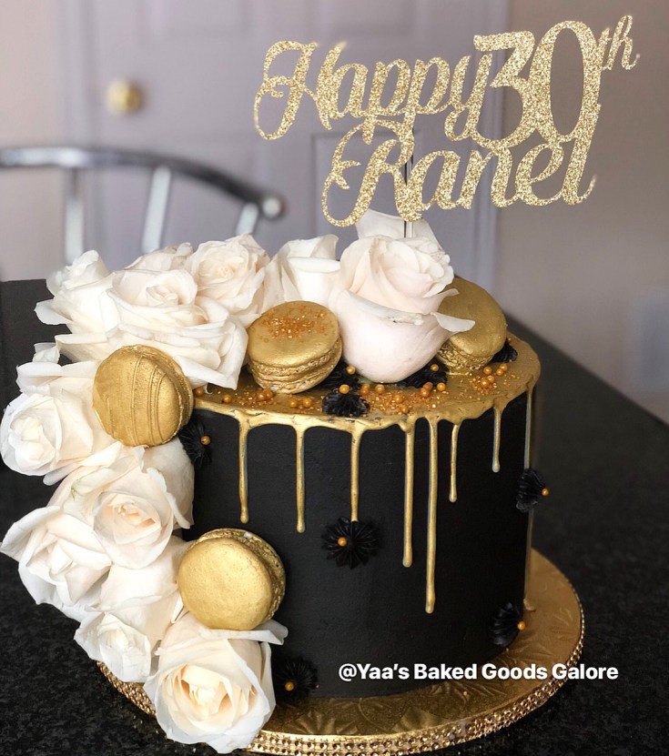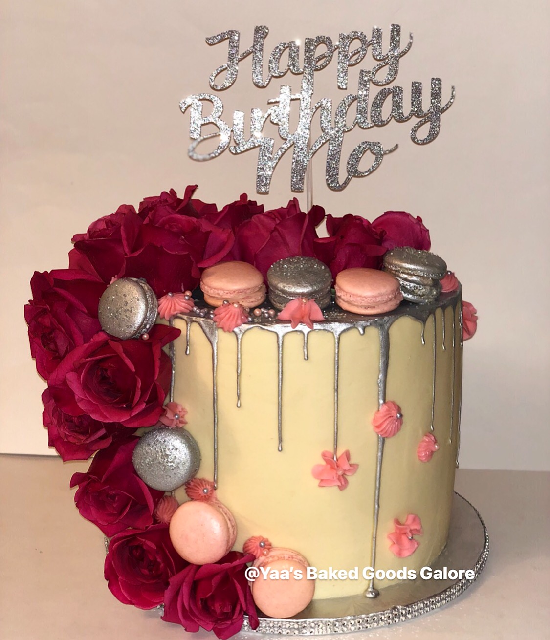 10″ 4 layer Vanilla cake w/ silver drip, fresh roses & macarons