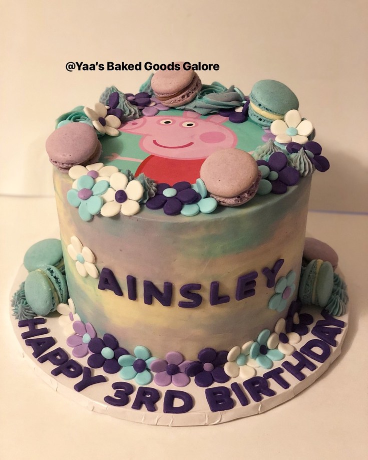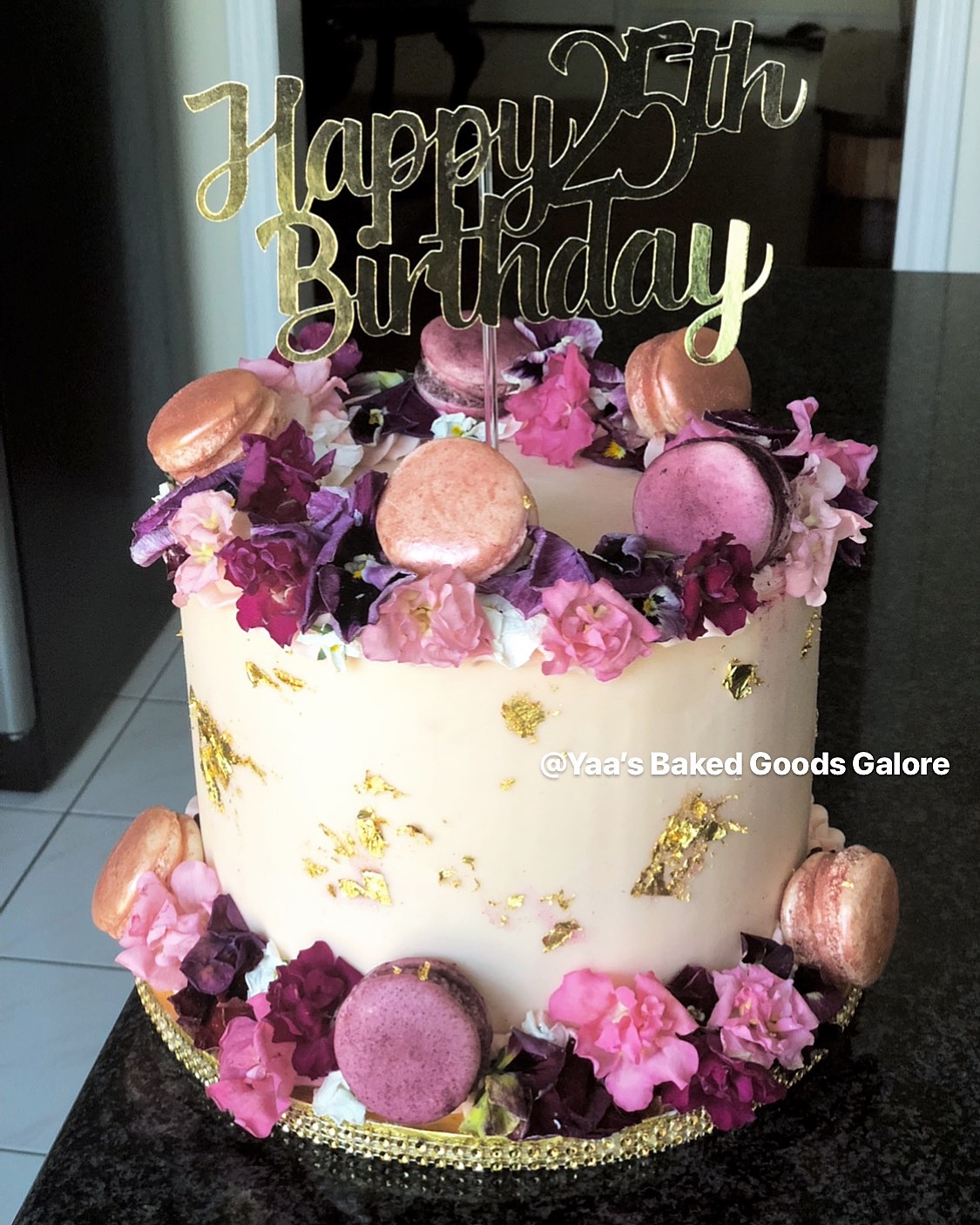 8″ Vanilla birthday cake w/ edible florals & macarons