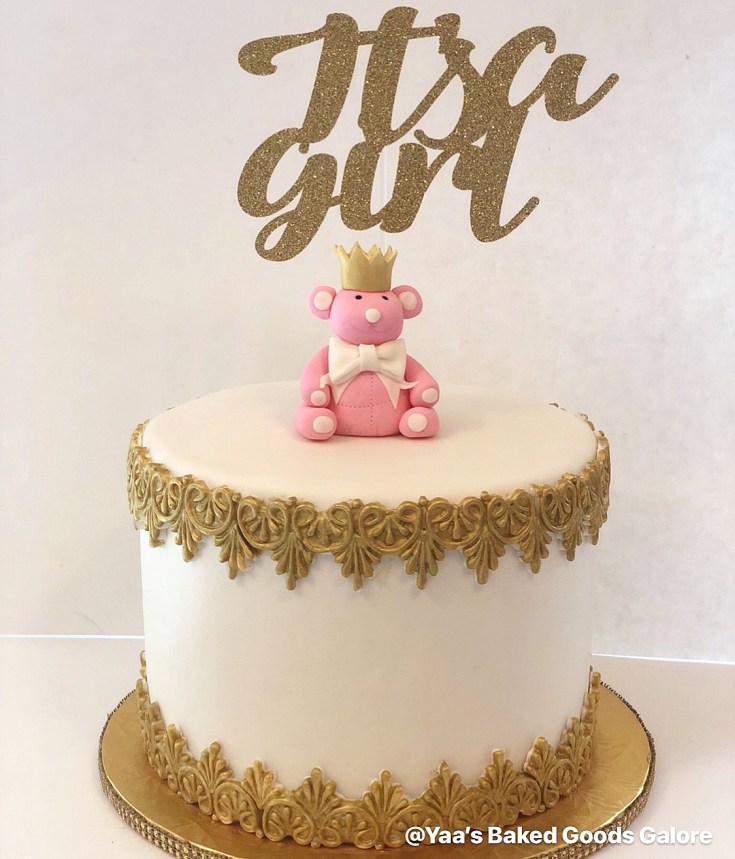 9″ 4 layer Vanilla custom baby shower cake w/ a handmade fondant teddy bear