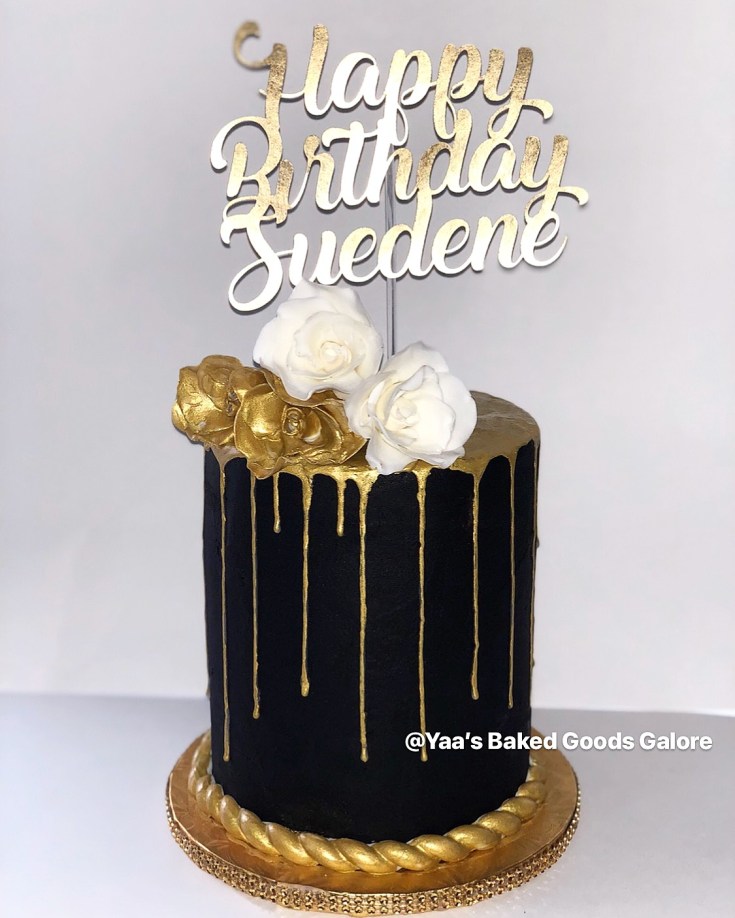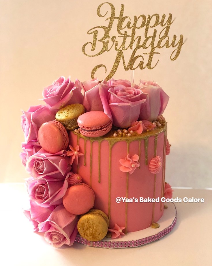 8″ Chocolate drip cake w/ fresh roses and macarons