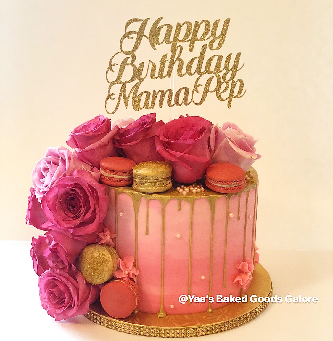 6″ Vanilla drip cake w/ fresh roses and macarons