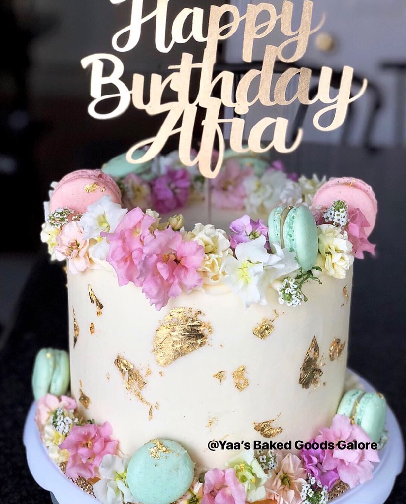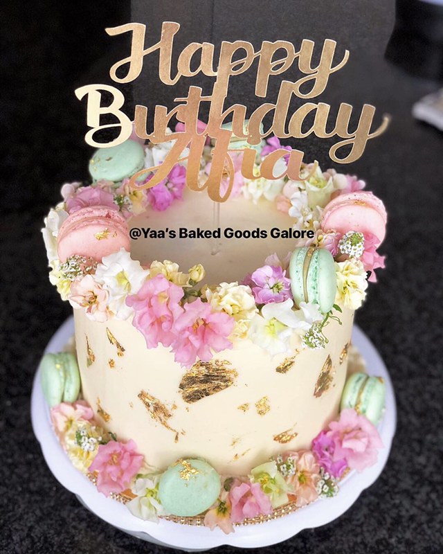 8″ Vanilla cake w/ edible flowers, macarons & edible gold