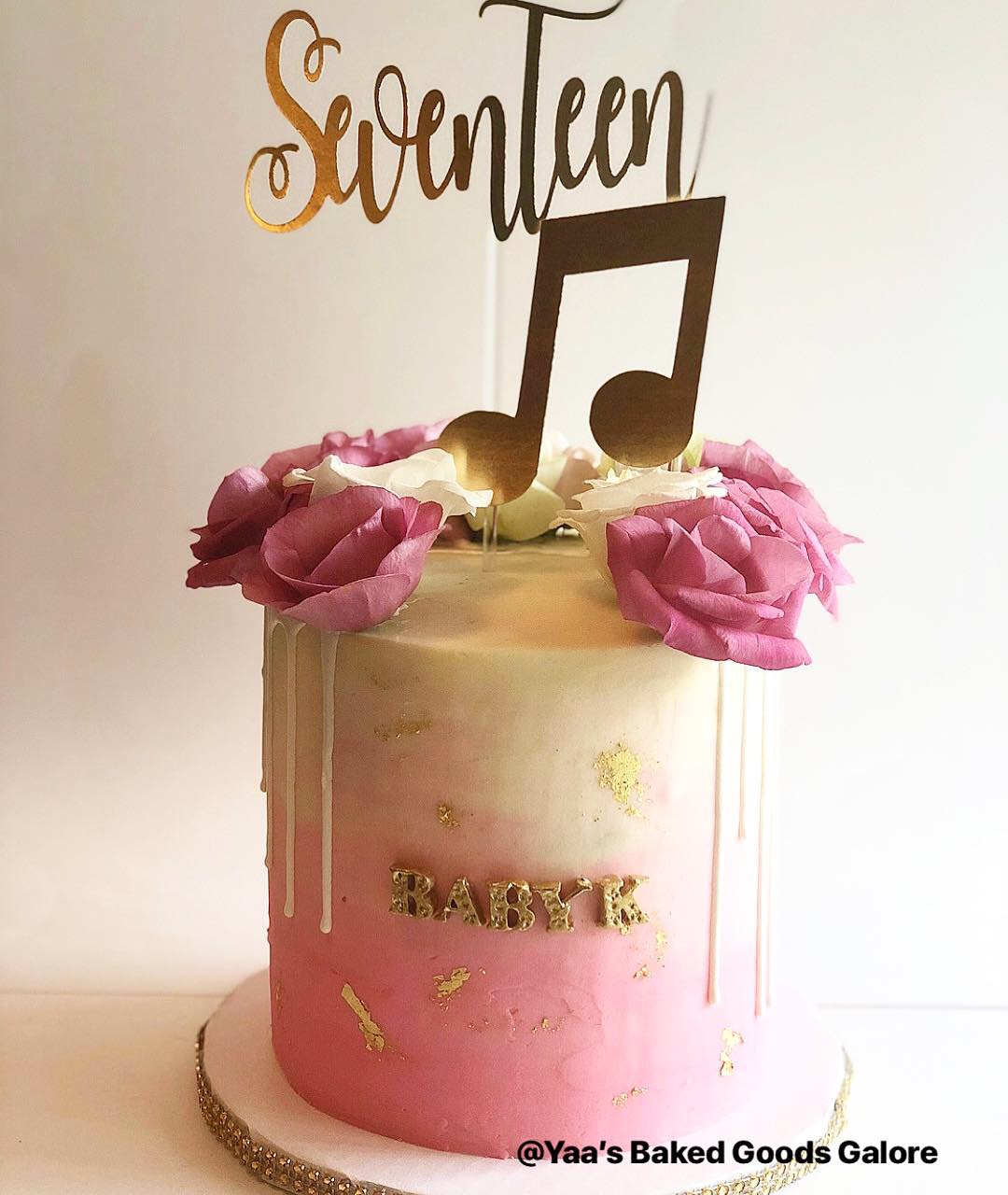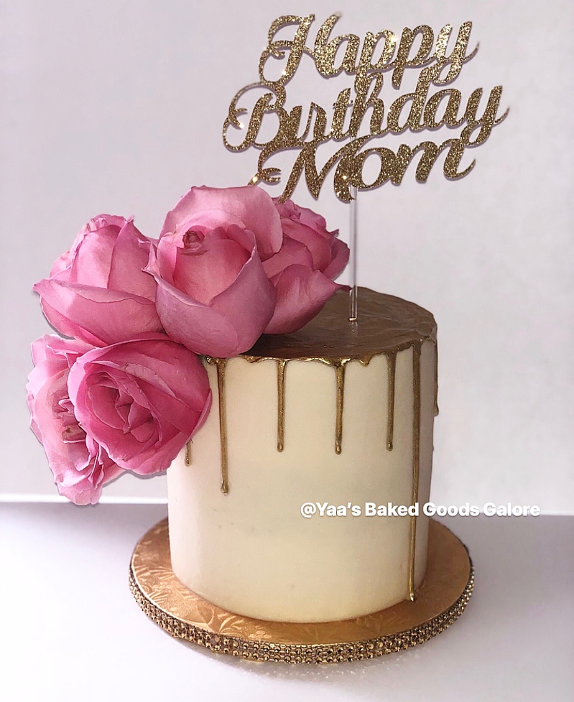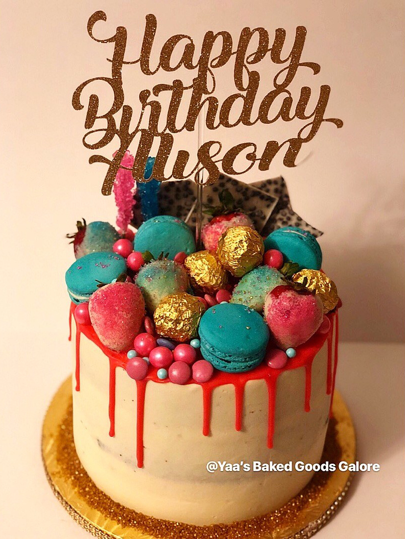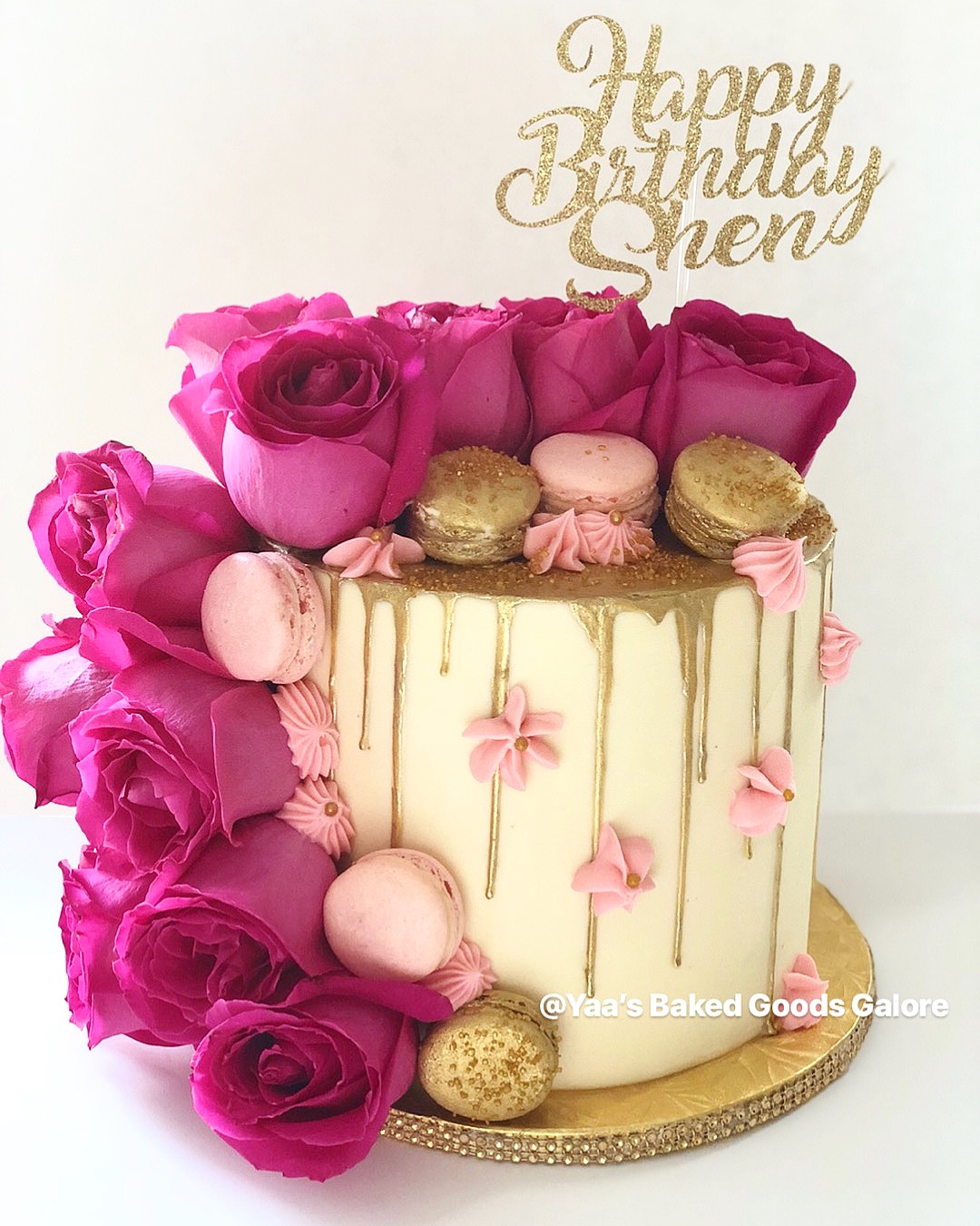 8″ 4 layer Red Velvet drip cake w/ fresh roses and macarons