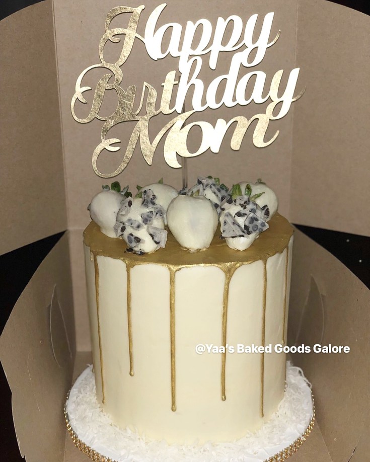 6″ Vanilla White Chocolate coconut drip cake w/ Chocolate covered strawberries